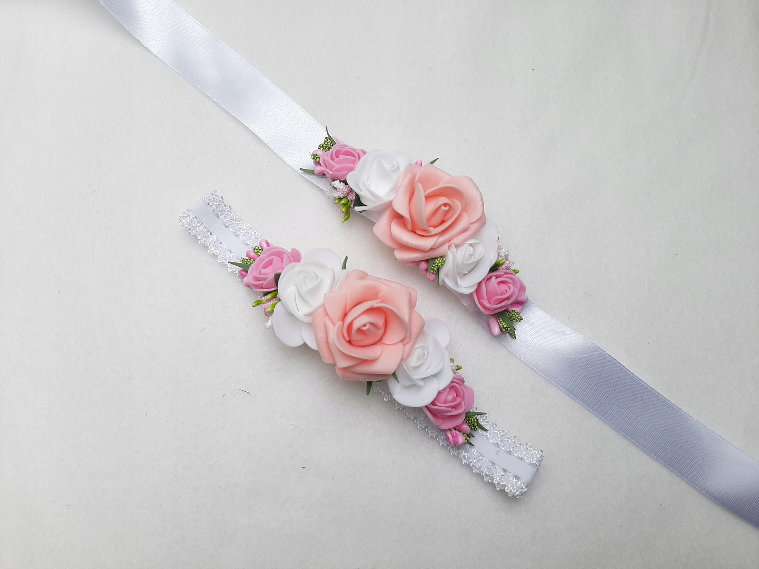 Пов'язка надіта на гумку, шириною близько 2 см. Мереживо дуже ніжне, гнучке і виглядає елегантно. Квіткова композиція приблизно 13-14 см х 5 см, складається з квітів розміром 4 см, 3 см і 2 см.