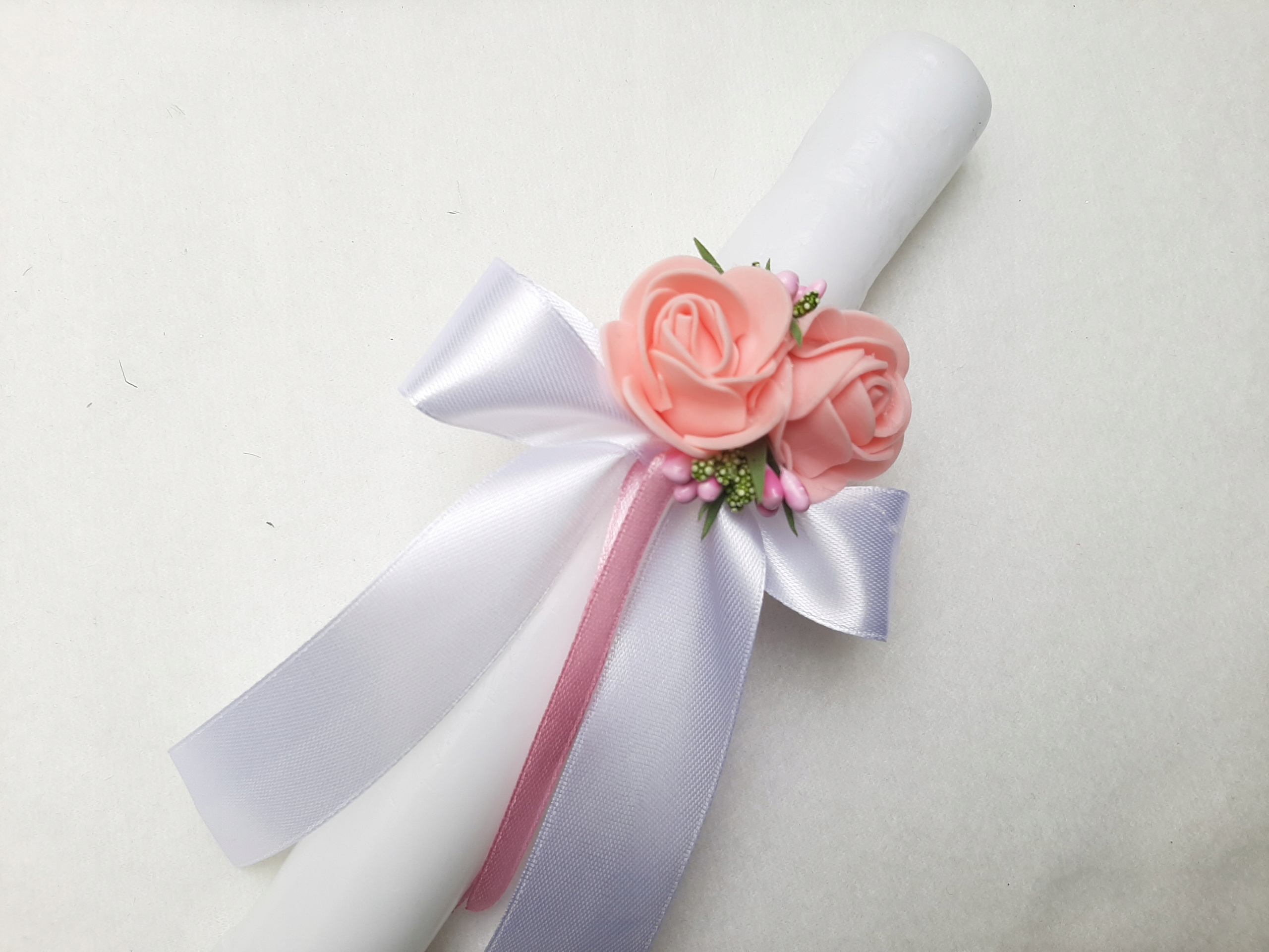 Декорація свічки складається з 3 троянд, кожна розміром 3 см, з додаванням декоративних страз і стрічка. Вся штука розміщена на еластичному шнурку, завдяки чому добре тримає свічку.