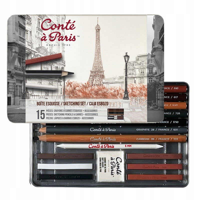 Високоякісні олівці та бруски із серії Conte a Paris. Олівці в оправі з кедрового дерева та смугами/пастель у відтінках чорного, коричневого, сірого та білого. Набір дозволяє створювати цінні малюнки та швидкі ескізи. У набір також входить гумка і вішалка діаметром 5 мм. На металевій коробці на кришці принт - фотографії міста.