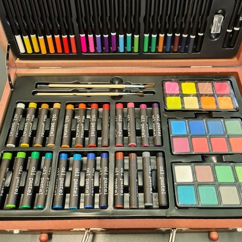 - БАГАТО КОМПОНЕНТІВ – набір для малювання у валізі має багато елементів: 24 кольорові олівці; 12 акварельних фарб; 24 масляні пастелі; 24 воскових олівця; 2 шт. олівців HB I 2B; 1 шт точилка; 1 шт гумка; 24 акварельні фарби на палітрі; 2 дошки полотна (А4 і А5); 2 шт кисті; 1 шт піддон; 1 чохол