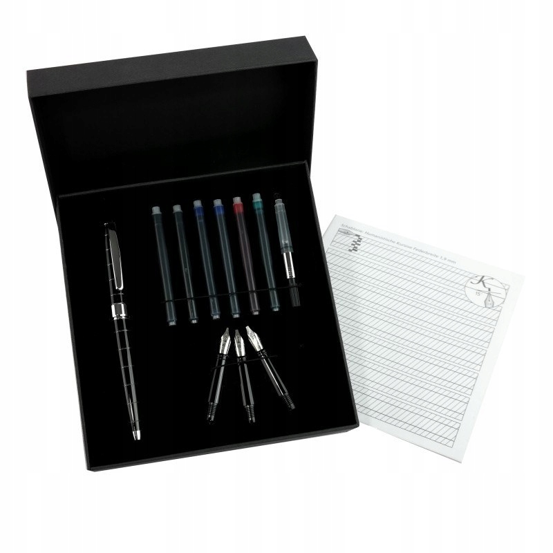 Cretacolor Calligraphy Handwriting Set — це оригінальний набір для каліграфії, що складається з 11 елементів, який можна використовувати як для розвитку базових навичок у студентів-початківців, які вивчають каліграфію. , а також відповідати очікуванням і потребам досвідчених каліграфів. У набір входить ручка (тримач) з високоякісного чорного лакового матеріалу, 3 тримачі з пером шириною 1,1 мм / 1,5 мм / 1,9 мм, 6 довгих чорнильних картриджів (2 x чорний, 2 x синій, 1 x червоний, 1 x x зелений), конвертер чорнила та інструкції з корисними шаблонами для вивчення правопису. Все упаковано в естетичну подарункову коробку.