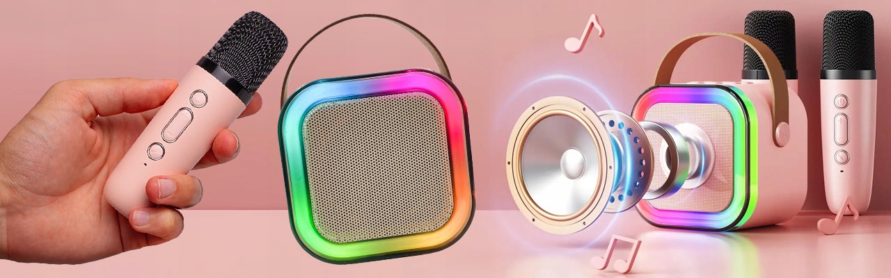 Почніть весело караоке! Міні караоке з двома мікрофонами та бездротовою колонкою – ідеальна пропозиція для людей, які люблять співати. Легкий дизайн і простота використання означають, що ви можете насолоджуватися музикою без обмежень, де б ви не були.
