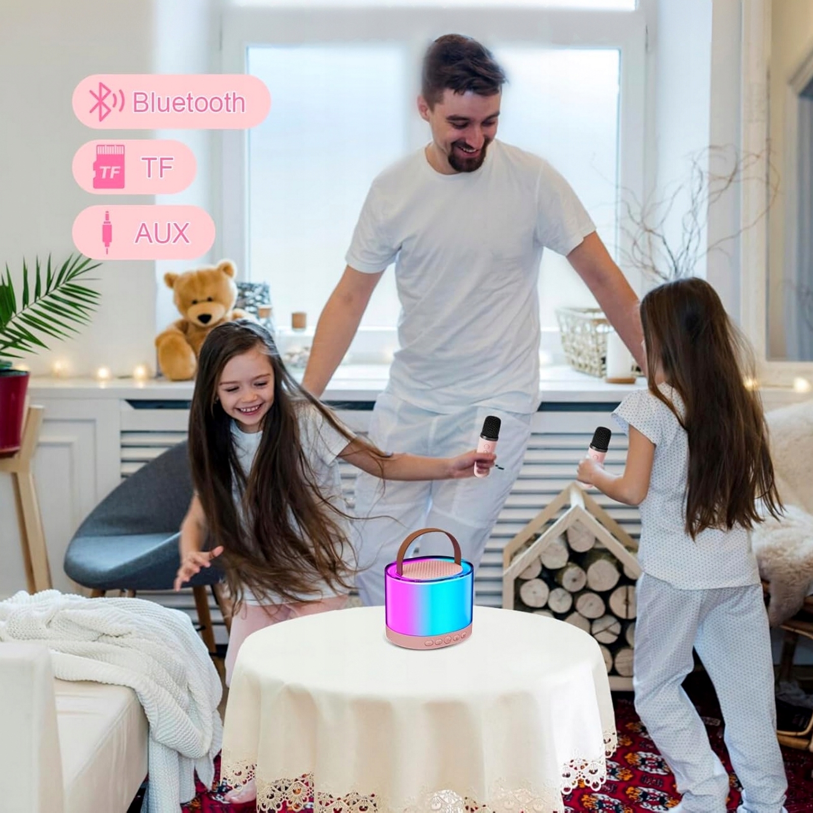 - Функції: Bluetooth, RGB, TF-карта, AUX, мікрофон, караоке