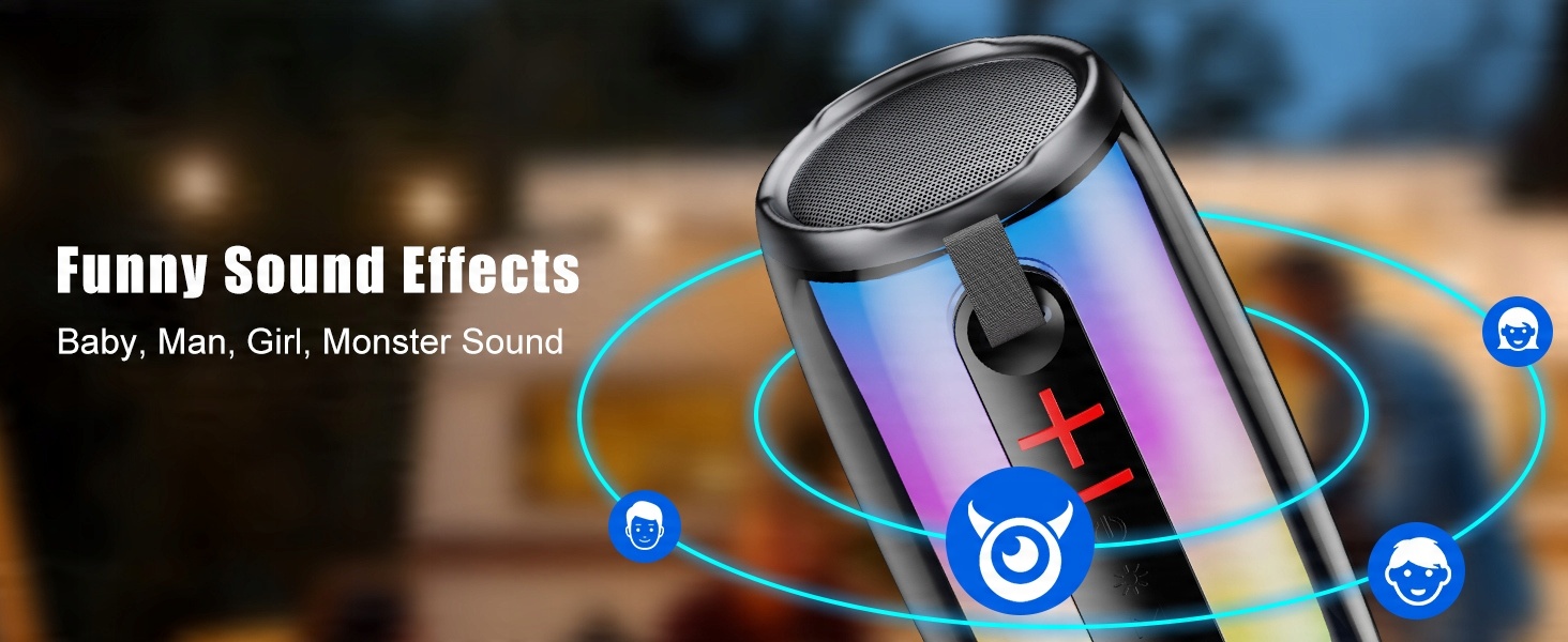 [Багатофункціональний міні-бездротовий мікрофон] - професійна караоке-машина постачається з 2 бездротовими міні-мікрофонами та гарним мікрофоном, має 4 голосові ефекти: чоловік, жінка, дитина та монстр. Утримуйте значок мікрофона, щоб перемикати голосові ефекти. Смішні зміни голосу, додайте веселості своїй вечірці. Ви можете збільшити/зменшити гучність людського голосу, натиснувши кнопки +/-