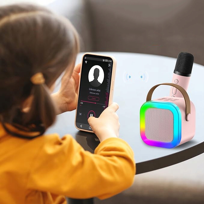 Цей дитячий караоке-автомат дуже легкий і ідеально підходить для співу дітей. Динамік подасть звуковий сигнал, щоб сповістити про успішне підключення, а синій індикатор залишиться світитися. Якщо пристрій не підключено, блимає синій індикатор. Після створення пари ви можете швидко натиснути кнопку «Відтворити», щоб відтворити або призупинити музику.