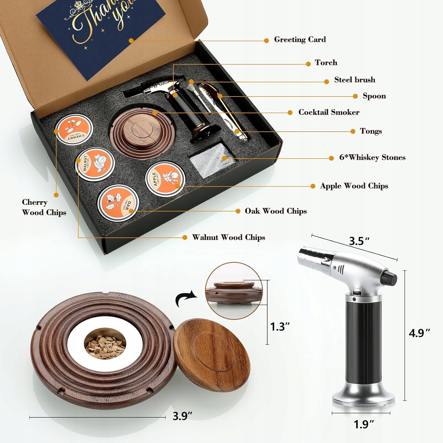 Все, що потрібно для приготування ідеального коктейлю Смокі! У набір входить димохід для копчення, пальник, набір дерев’яних стружок, каміння для віскі та практичні аксесуари, завдяки яким ви зможете створити унікальний напій із димним ароматом всього за кілька хвилин.