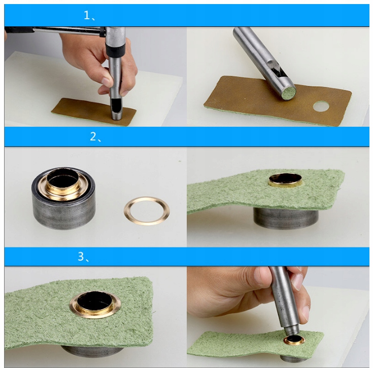 Набір, який дозволяє легко вирізати отвір і прикріпити вушка до матеріалу. Представлений набір складається з трьох металевих частин: