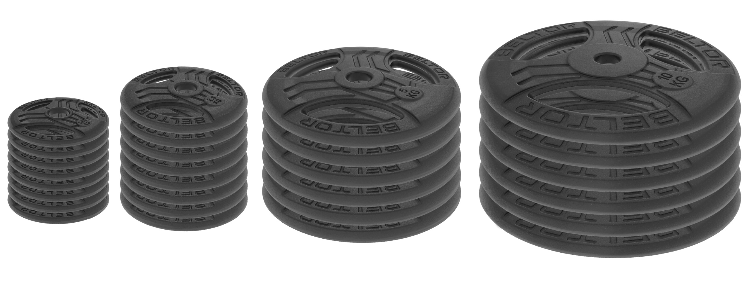 - Конфігурація: 6x 10 кг / 6x 5 кг / 8x 2,5 кг / 8x 1,25 кг