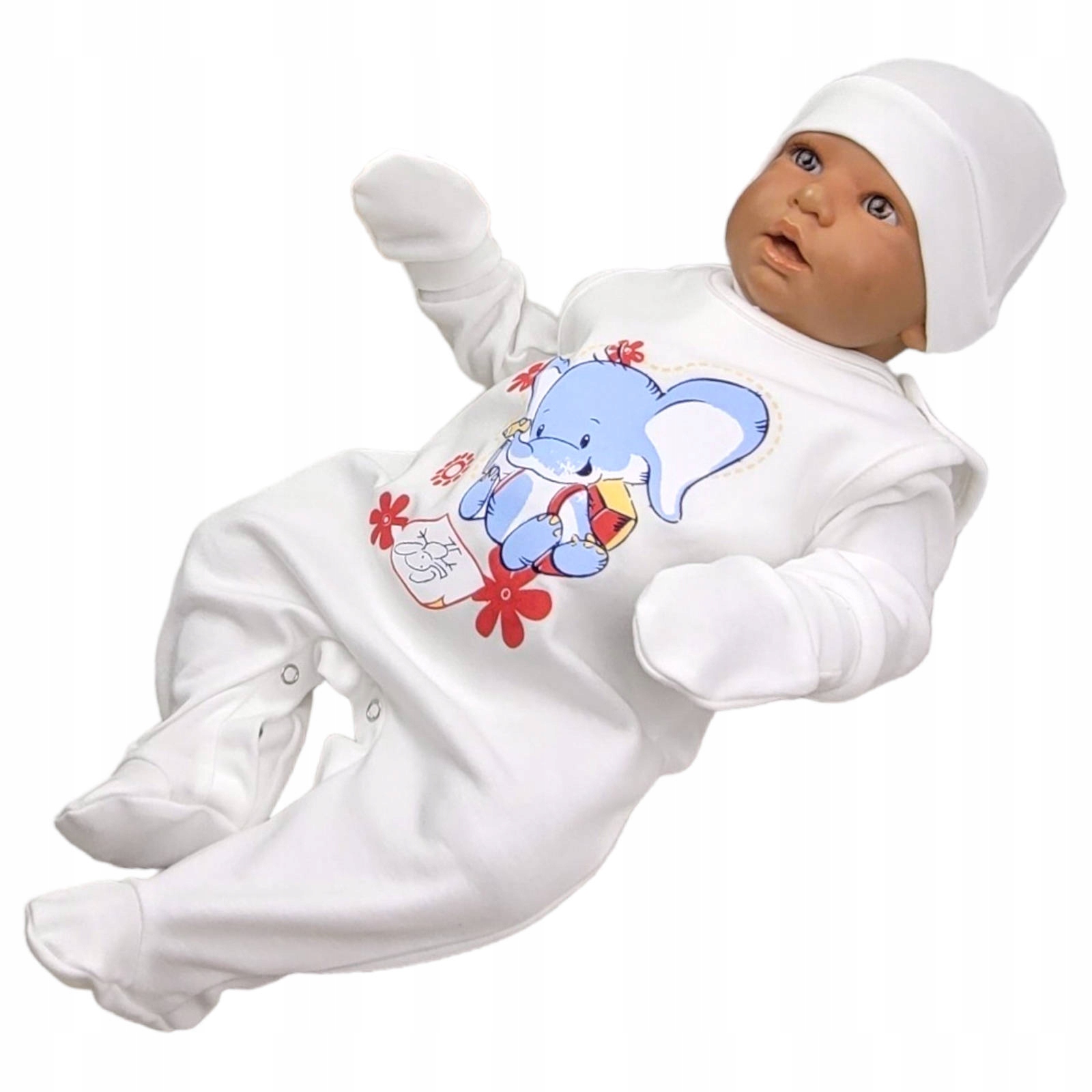 Layette з безпечного матеріалу для ніжне тільце дитини. На комбінезонах і боді є аплікація Слон, яка додає шарму та викликає посмішку на обличчях батьків та інших людей. Набір виготовлений на 100% від польського виробника.