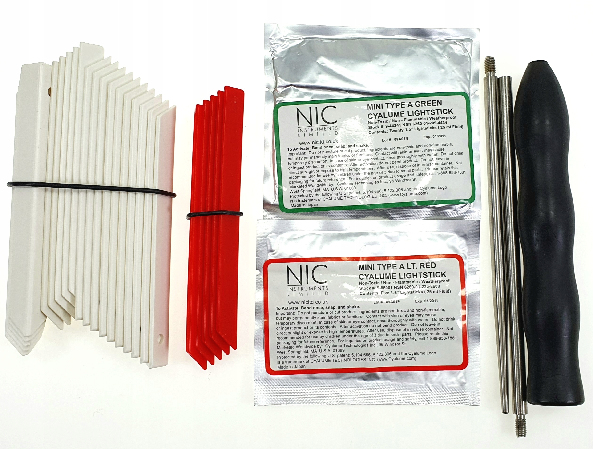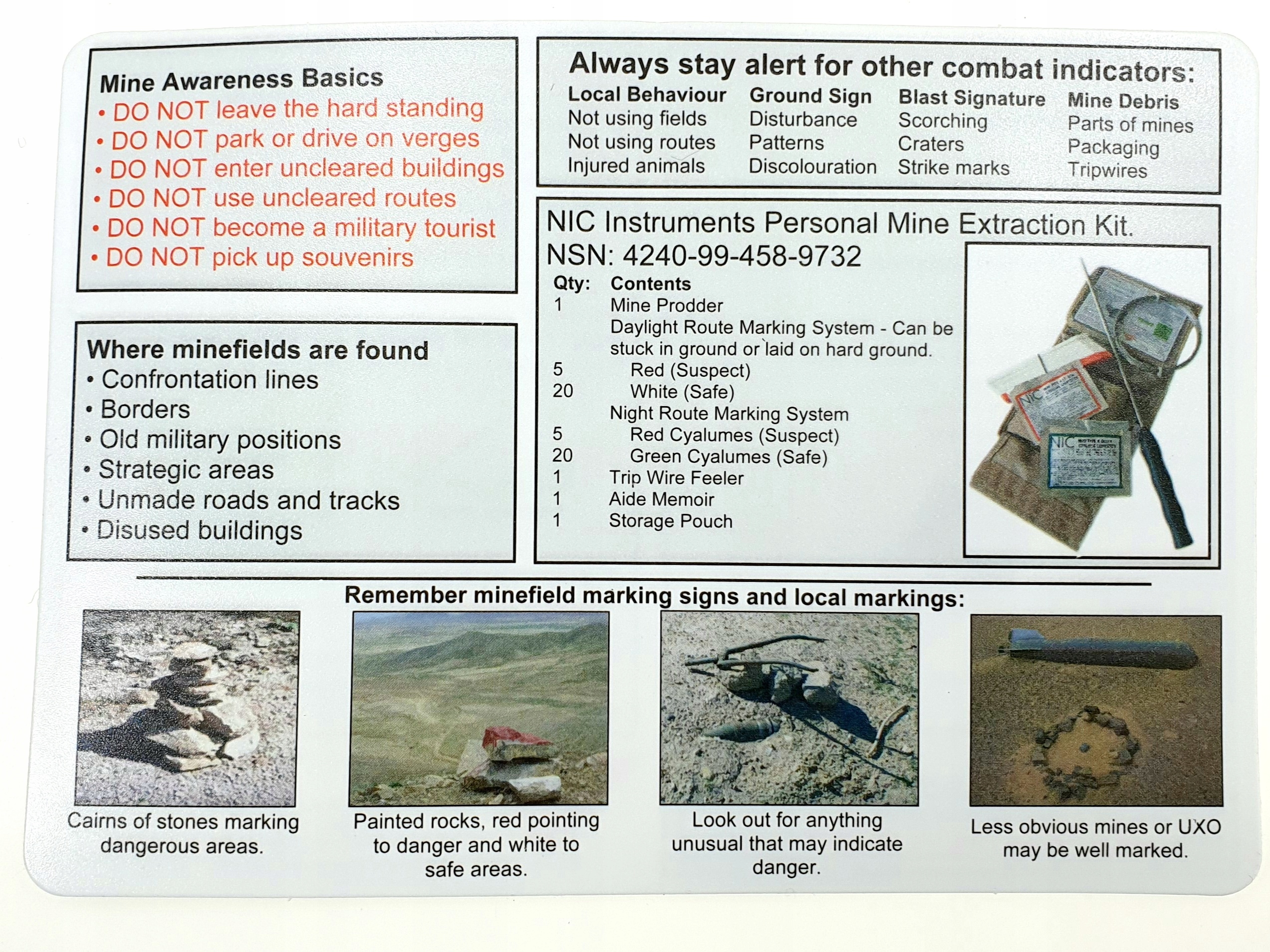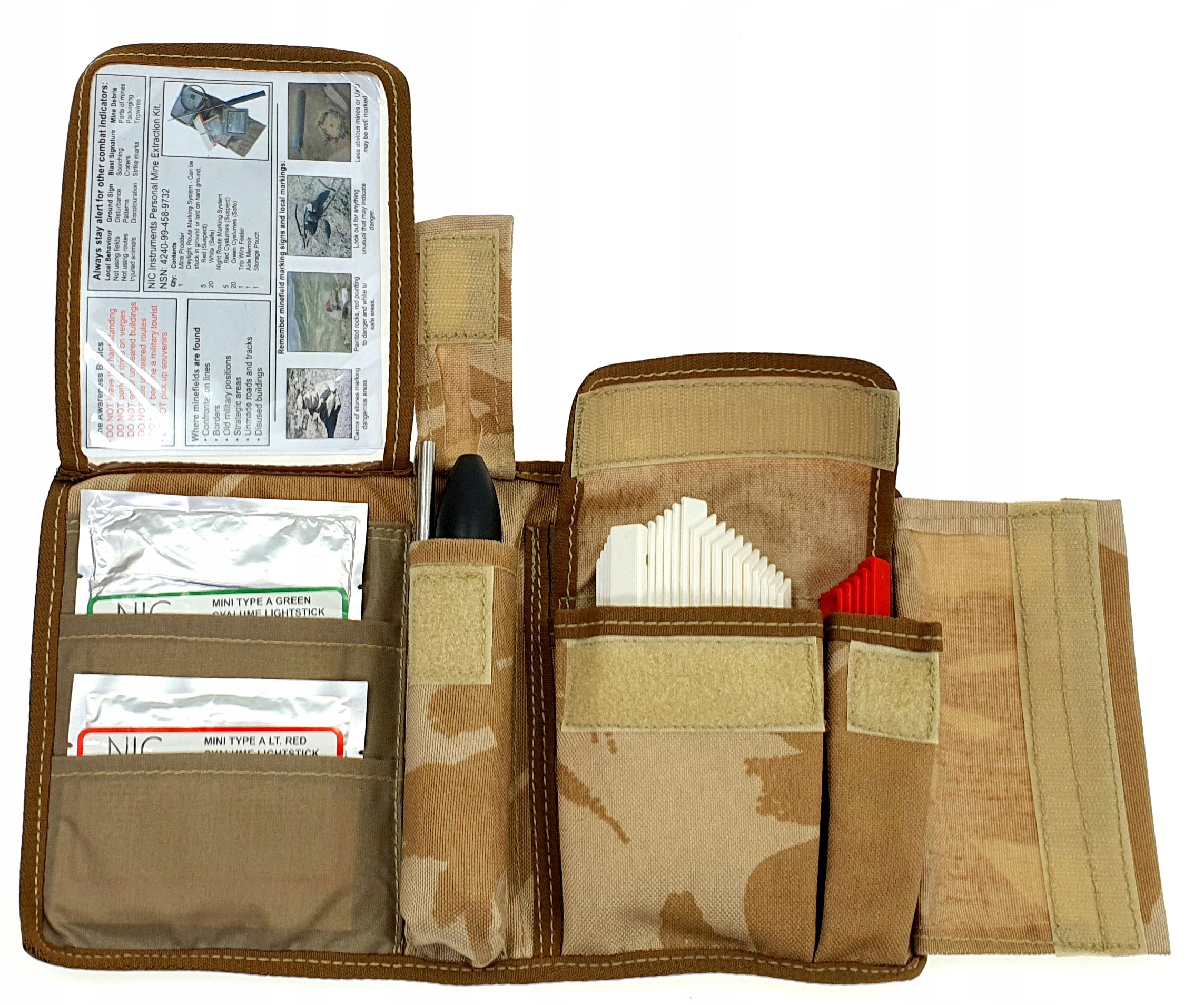 - Набір складається з: складного саперного щупальця, двоколірних маркерів, двоколірного міні світлові палички, сталевий трос, посібник/інструкція, обкладинка