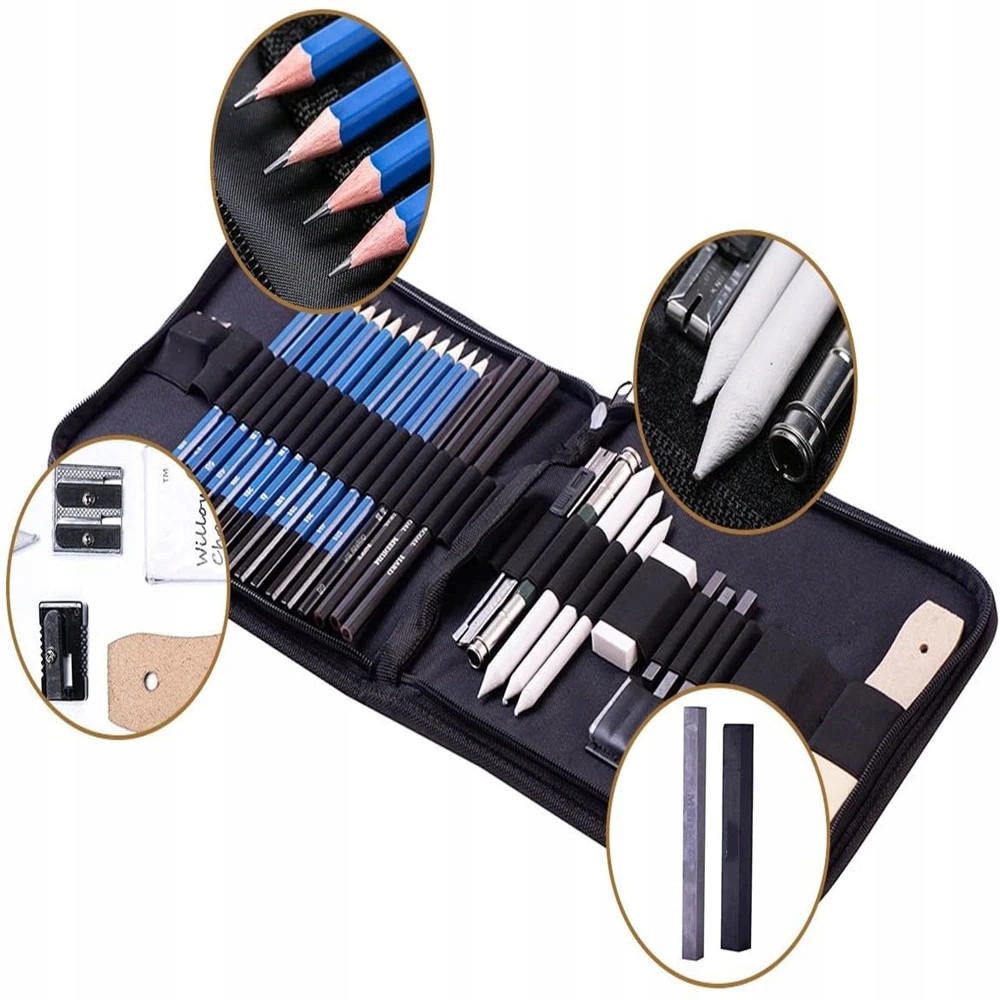 - 32 ELEMENTY - набір має дуже великий вибір елементів, призначених для скетчінга, малювання тощо. Ви можете виберіть олівці різних розмірів, блокноти, шматочки вугілля, гумки та багато інших корисних інструментів для письма під час роботи.