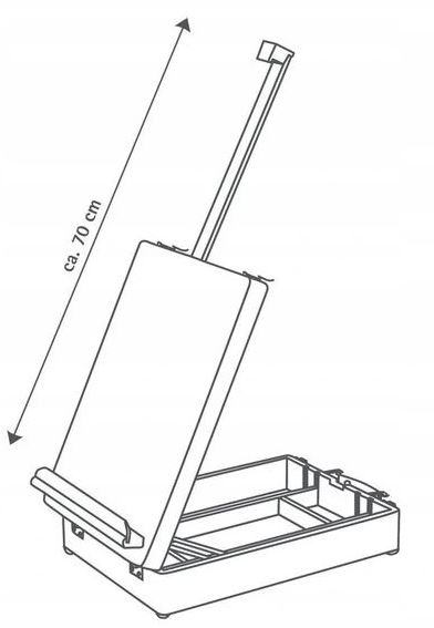 Мольберт виготовлений з дерева сосни, обробленої маслом. Розміри закритої валізи наступні: 33 x 13 x 45 см (Ш x В x Г). Валіза містить ручку та міцні пряжки, які тримають мольберт разом. Зовні висувний горизонтальний кронштейн з полицею, що дозволяє кріпити полотно висотою до 70 см.