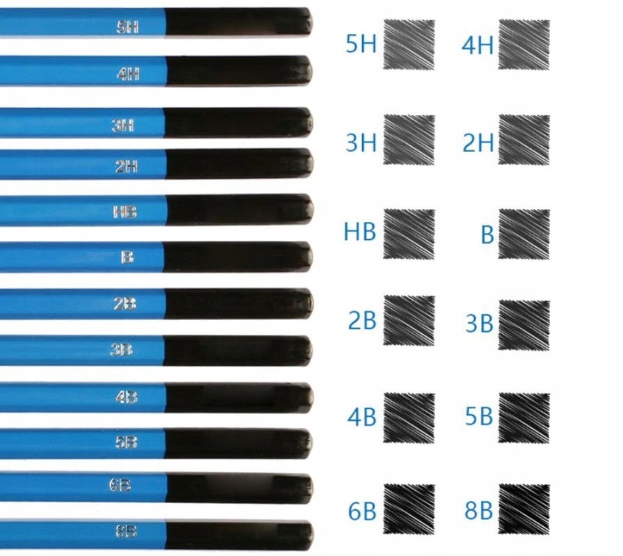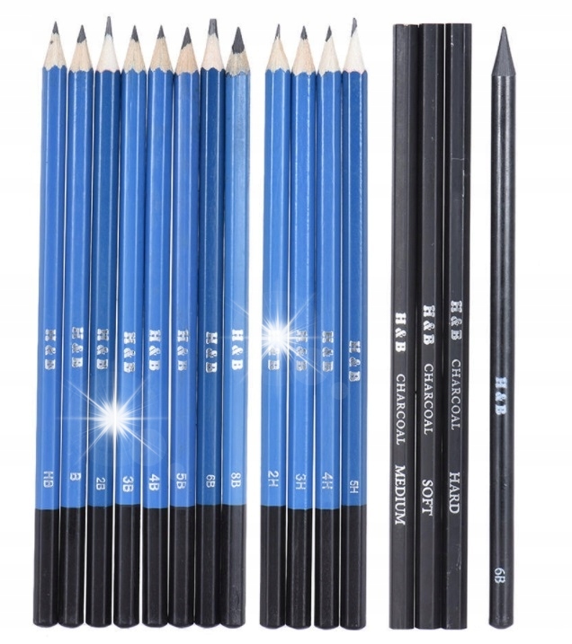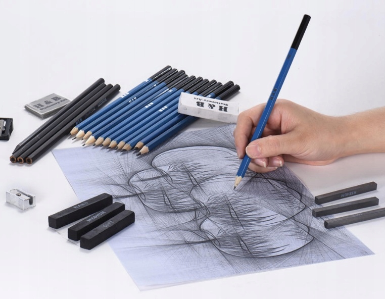 - олівці - 12 олівців для ескізів, 3 вугільні олівці (м'які, середні, тверді) та 1 графітовий олівець 6b; Висока якість виготовлення забезпечує зручність використання та тривалого життя,