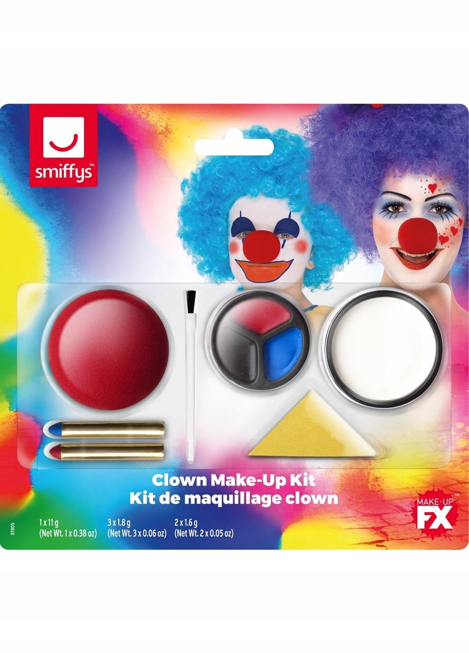 - набір містить: 4 фарби (біла, червона, синя, чорна), губка, пензлик, ніс, 2 олівці (червоний, синій)