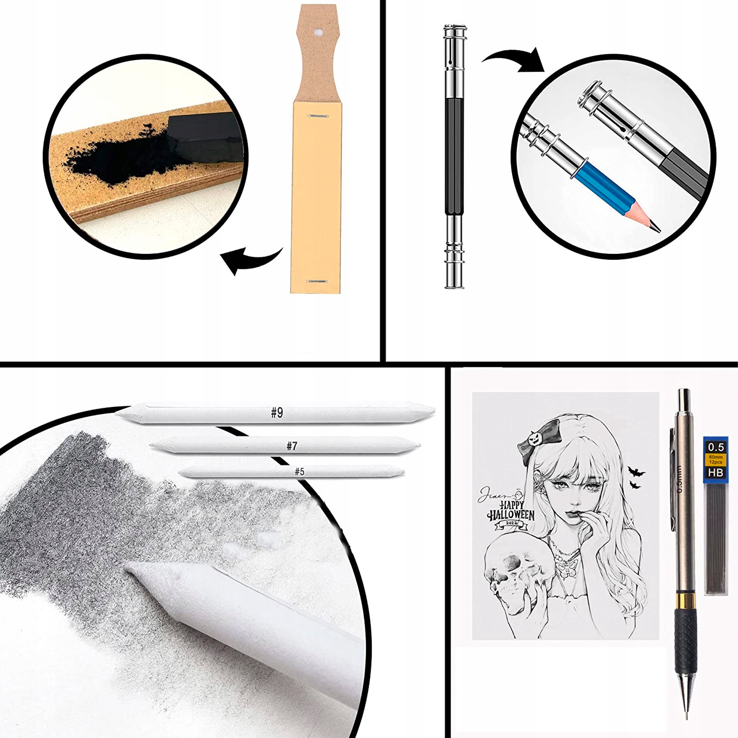 ✍️ Різні аксесуари, напр. вішалка для розмазування тіней, наждачний папір, набір для малювання вугіллям дозволять використовувати нові, цікаві техніки, подовжувач олівця, ластик, точилка, ніж, альбом для малювання та зручний футляр дозволяють щоб негайно почати малювати.