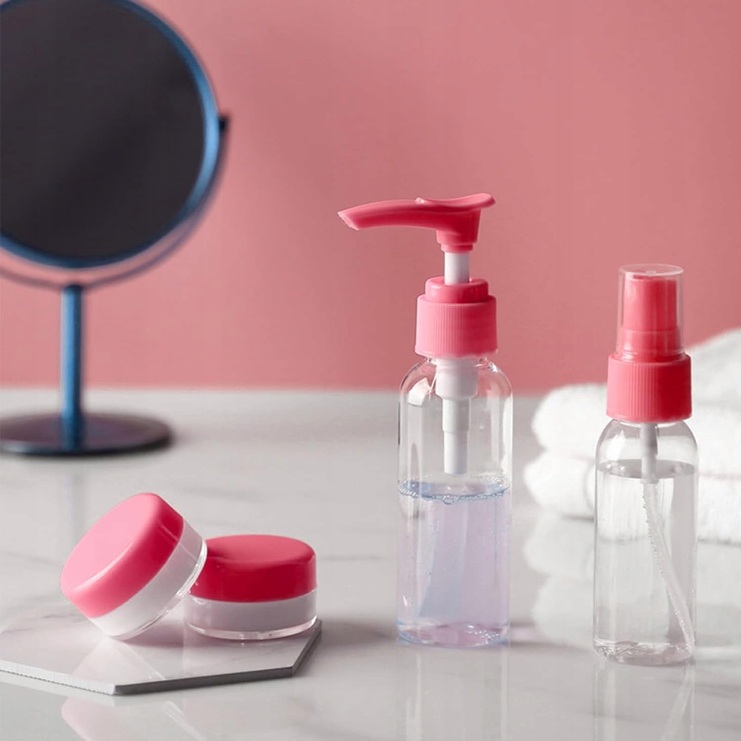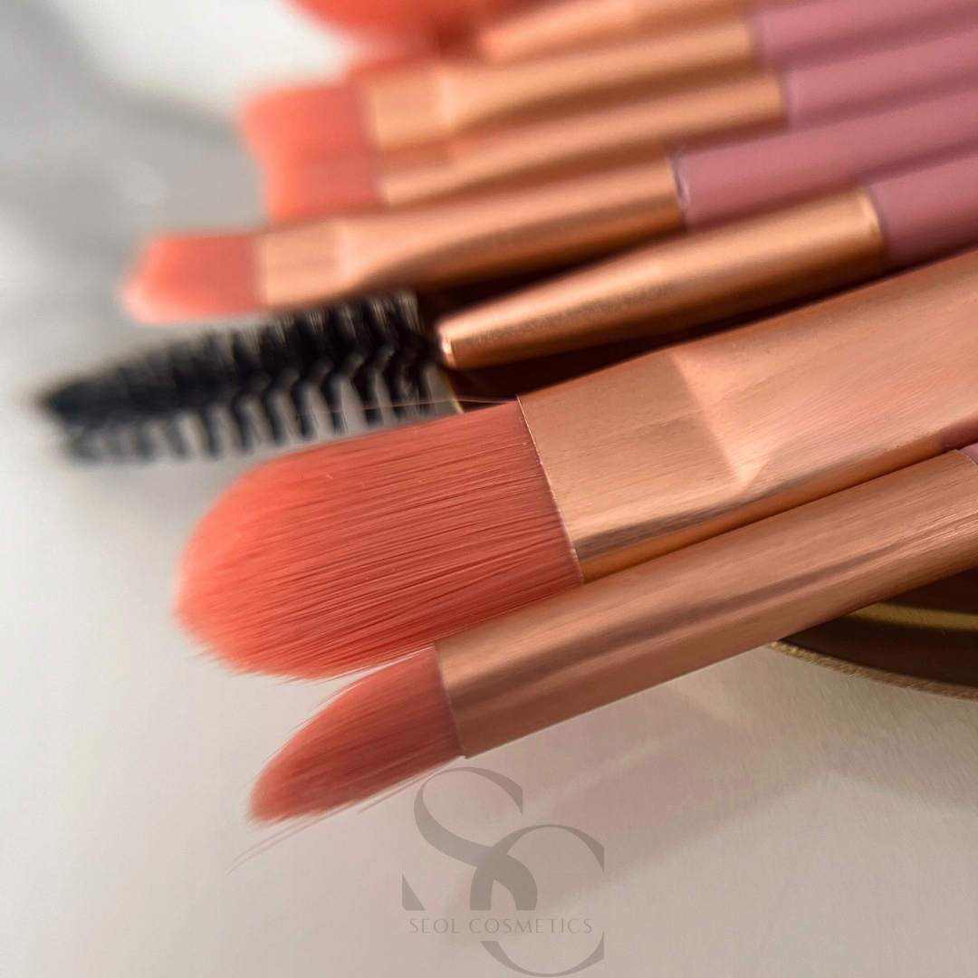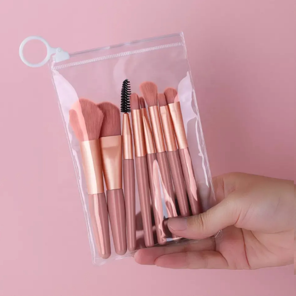Рожеві, легкі та зручні пензлі в прозорій косметичці, ідеально підходять для повсякденного макіяжу під час подорожі.
