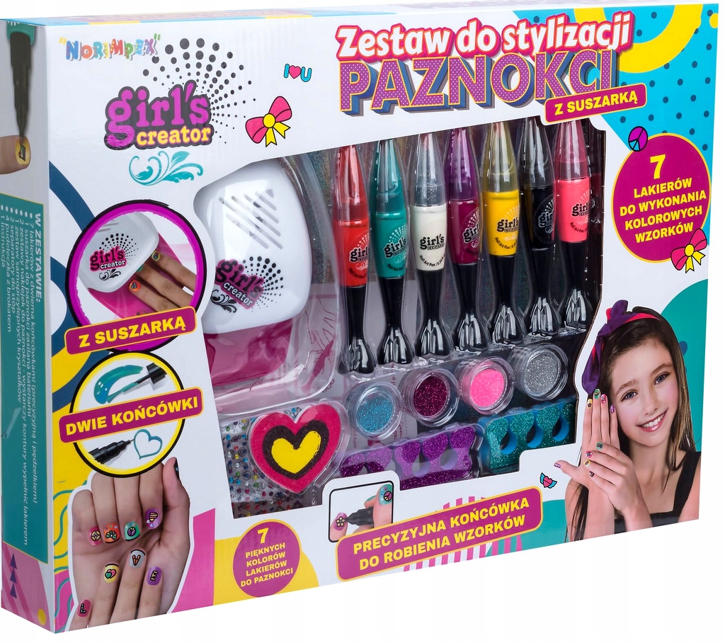 Вибір різнокольорових лаків для нігтів, розділювач для нігтів і фантастичні аксесуари для їх декорування змусять кожну маленьку леді відчути себе в справжньому салоні краси. Набір із сушаркою дає змогу різноманітно укладати нігті.