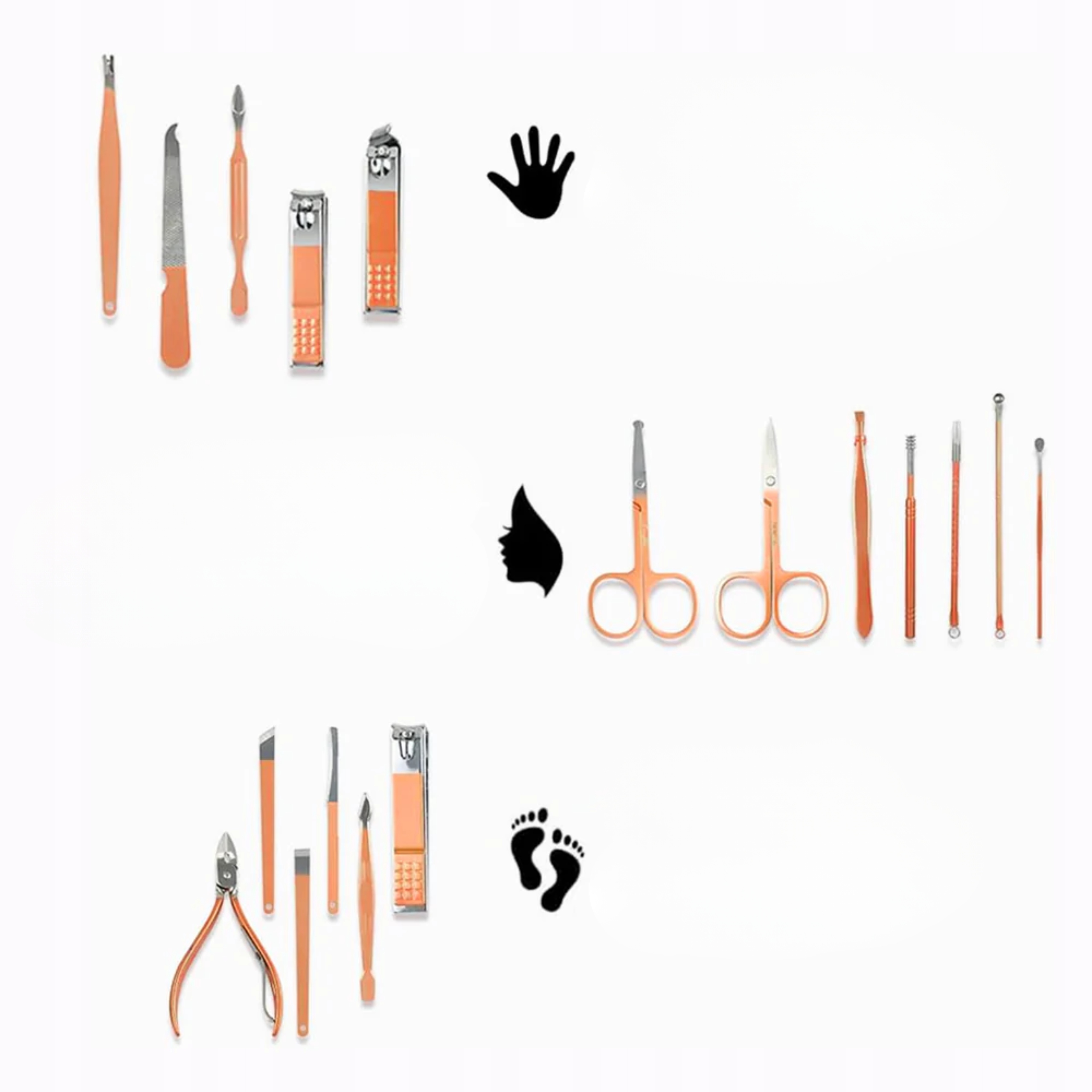 Відкрийте для себе сучасний та елегантний набір із 18 професійних інструментів для догляду за руками, ногами та обличчям у модному кольорі рожевого золота. Це ідеальне поєднання функціональності, якості та стилю, створене для людей, які цінують досконалість у домі.