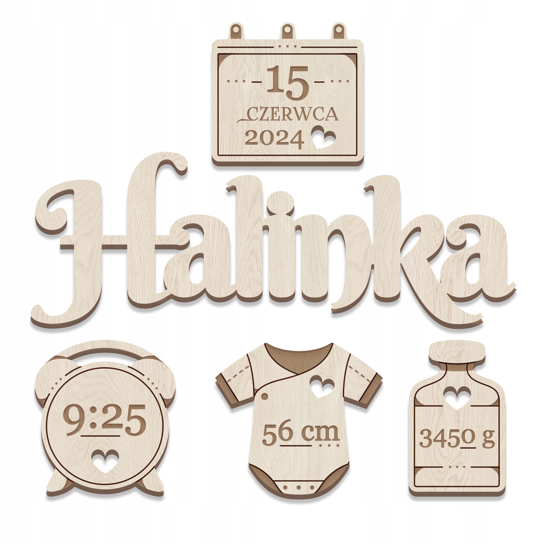 4 i, колір: натуральна деревина, товщина матеріалу: 3 мм, оригінальна конструкція елементів: висота 4см regner: ширина 3,3 см ; Висота 4см Календар: ширина 4см ; висота 3,7 см Хлопчик для тіла: ширина 4,4см ; висота 4см Дівчина тіла: ширина 4,2см ; Висота 4см Ім'я: висота близько 3,5 см