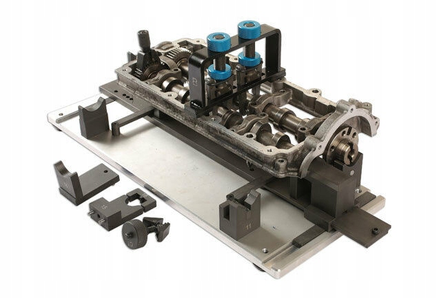 Набір інструментів включає регульовану основну пластину та додаткові пристрої, що дозволяють налаштовувати фази розподільних валів після їх демонтажу з головки двигуна.