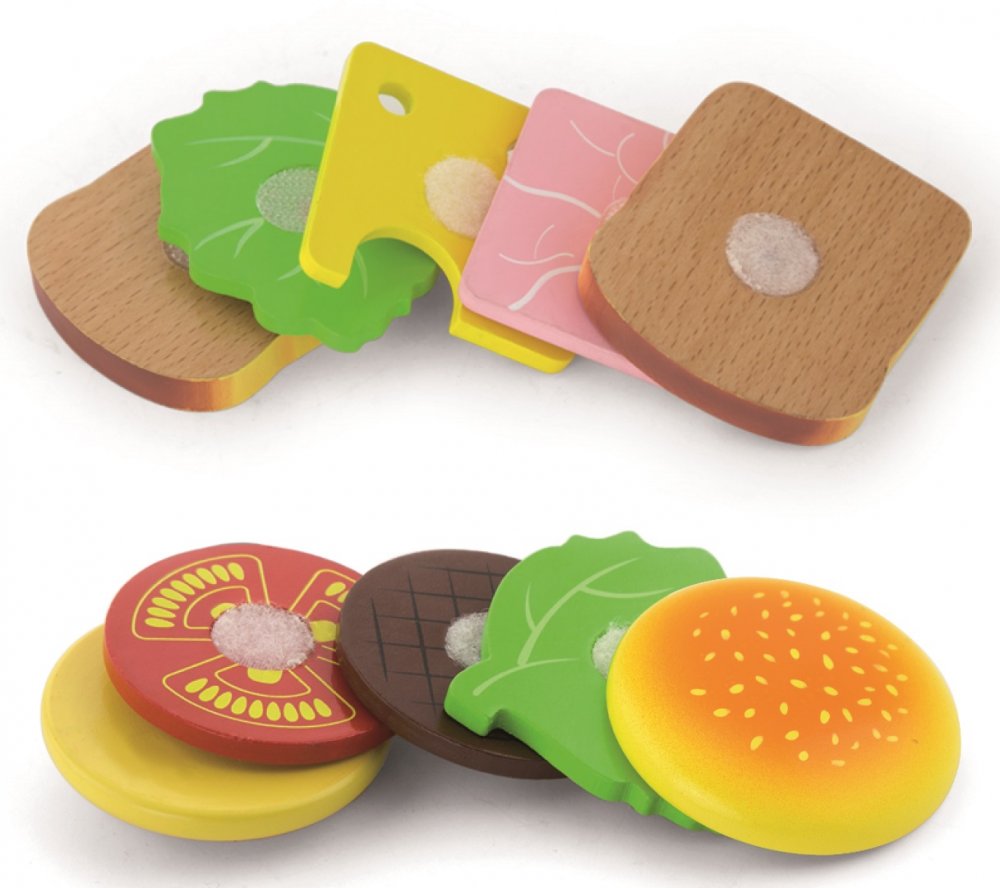 - Набір містить: ніж, 2 скибочки тосту, 1 булочку для гамбургера, 2 листя салату, 2 скибочки помідора, скибочку сиру, скибочку шинки та котлету для гамбургера