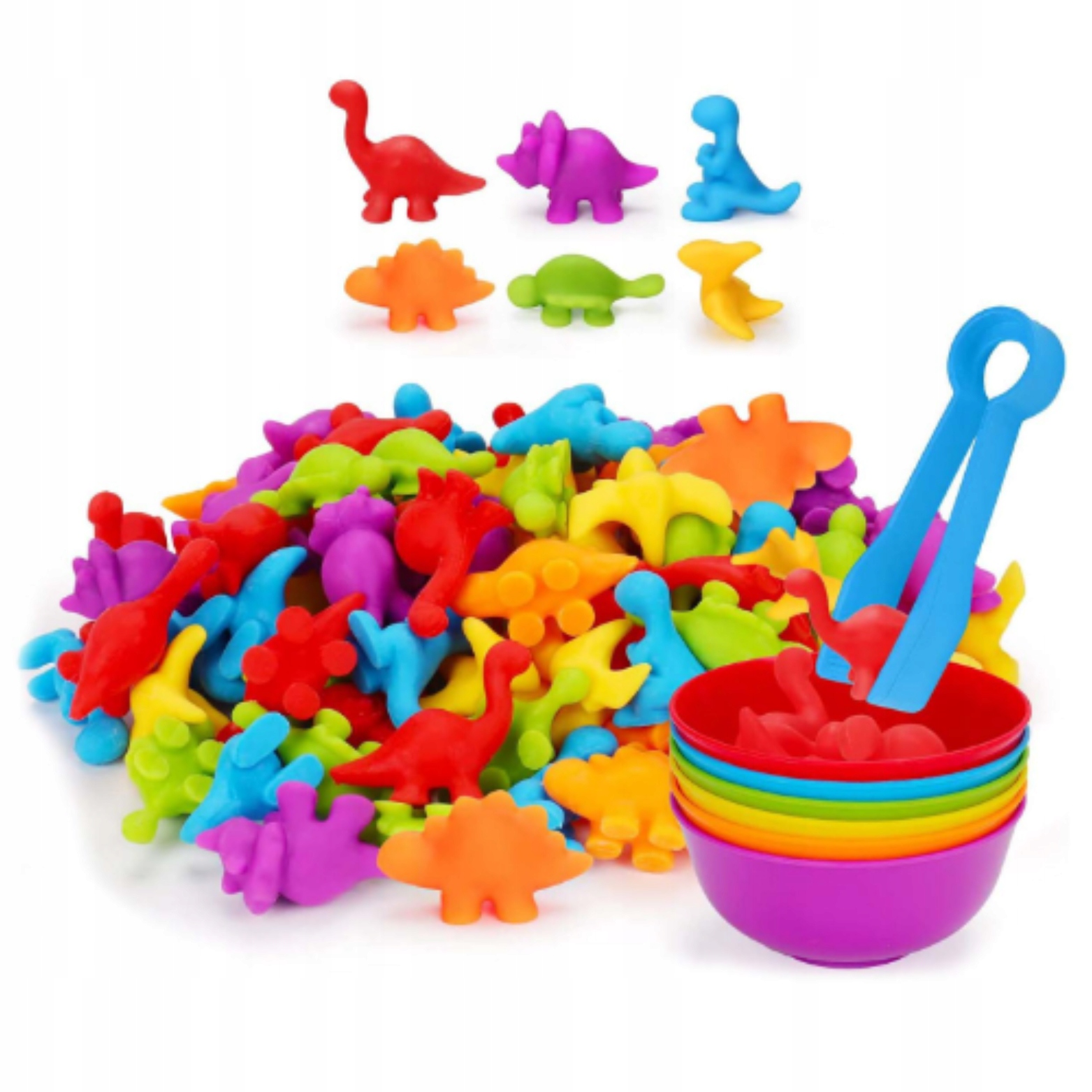 ❇️ Гра полягає в тому, щоб робити точні рухи та зосереджуватися. на підбір кольорів. Спочатку ми висипаємо всіх динозаврів на стіл, а потім розставляємо 6 чашок різних кольорів, створюючи місце призначення для наших динозаврів.