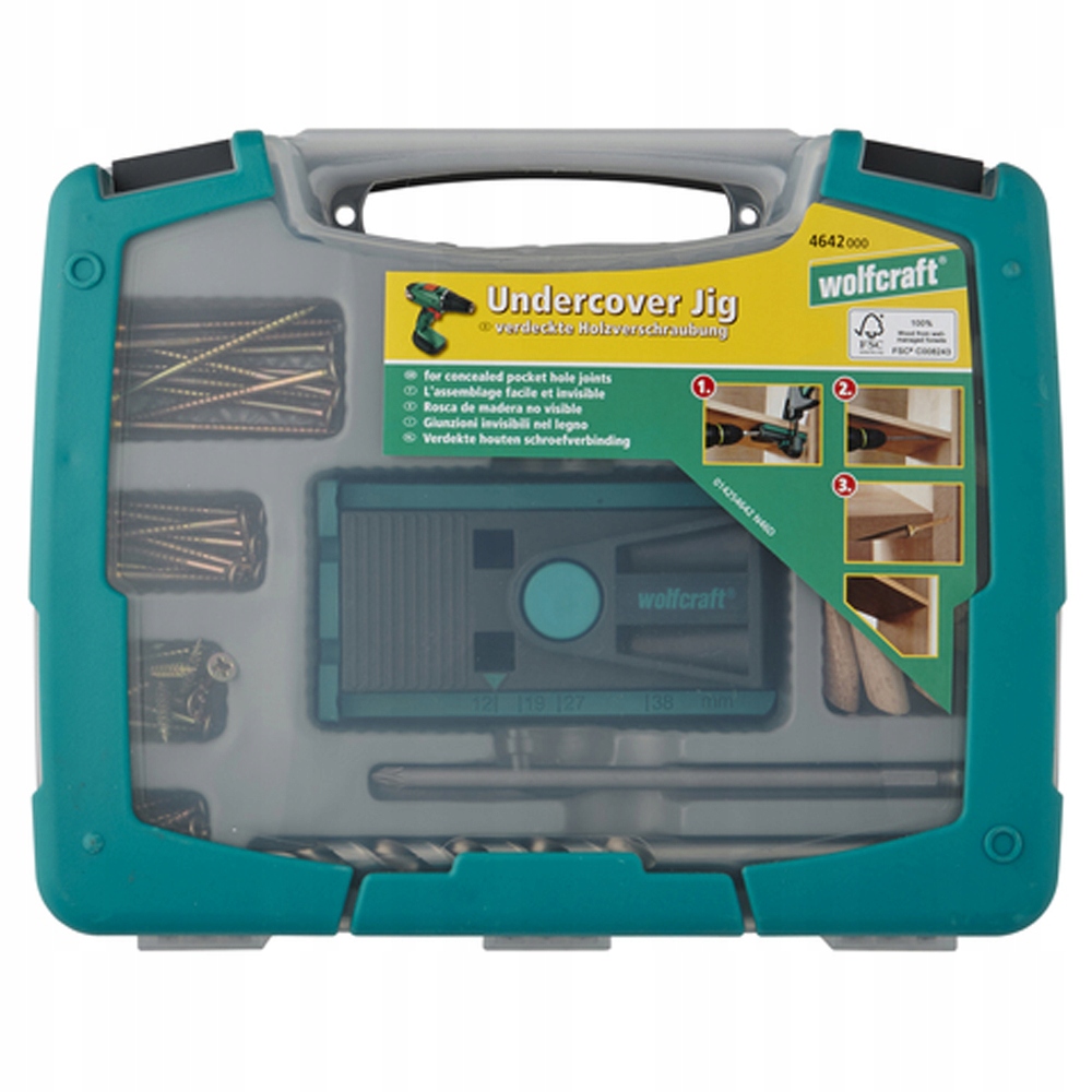 Набір прихованих зажимних пристосувань Wolfcraft — це комплексний повний пакет, що містить усе необхідне для свердління та створення прихованих гвинтових з’єднань у деревині. Створення точного та стабільного з’єднання без особливих зусиль лише за 3 кроки. Основним елементом цього набору є Undercover Jig - шаблон для свердління кишенькових отворів. У набір також входить спеціальне свердло, обмежувач глибини свердління, шестигранний ключ, шурупи з відповідним наконечником викрутки та дерев'яні дюбелі. Набір Undercover Jig дозволяє робити точні похилі отвори, в які потім вкручуються шурупи, щоб отримати точне та стабільне з’єднання дерев’яних елементів. Товщину дошки можна виміряти безпосередньо на шаблоні отвору. Шаблон містить практичну шкалу з позначеними найпопулярнішими товщинами плит - від 12 мм. У набір також входить ступінчасте свердло: кінчик свердла використовується для свердління маленького направляючого отвору для різьблення гвинта, тоді як 2-й крок свердла розсвердлює отвір для головки гвинта. Після виконання отворів дерев’яні елементи можна міцно з’єднати шурупами. Найбільшою перевагою в порівнянні зі звичайним гвинтовим з’єднанням є невидимі ззовні гвинти. Дерев'яні заглушки, що входять в комплект, закривають отвори. Це найбільш точний і простий спосіб з’єднання деталей. Набір Undercover Jig ідеально підходить для виготовлення меблів і ремонту ящиків, полиць, стелажів і шаф.