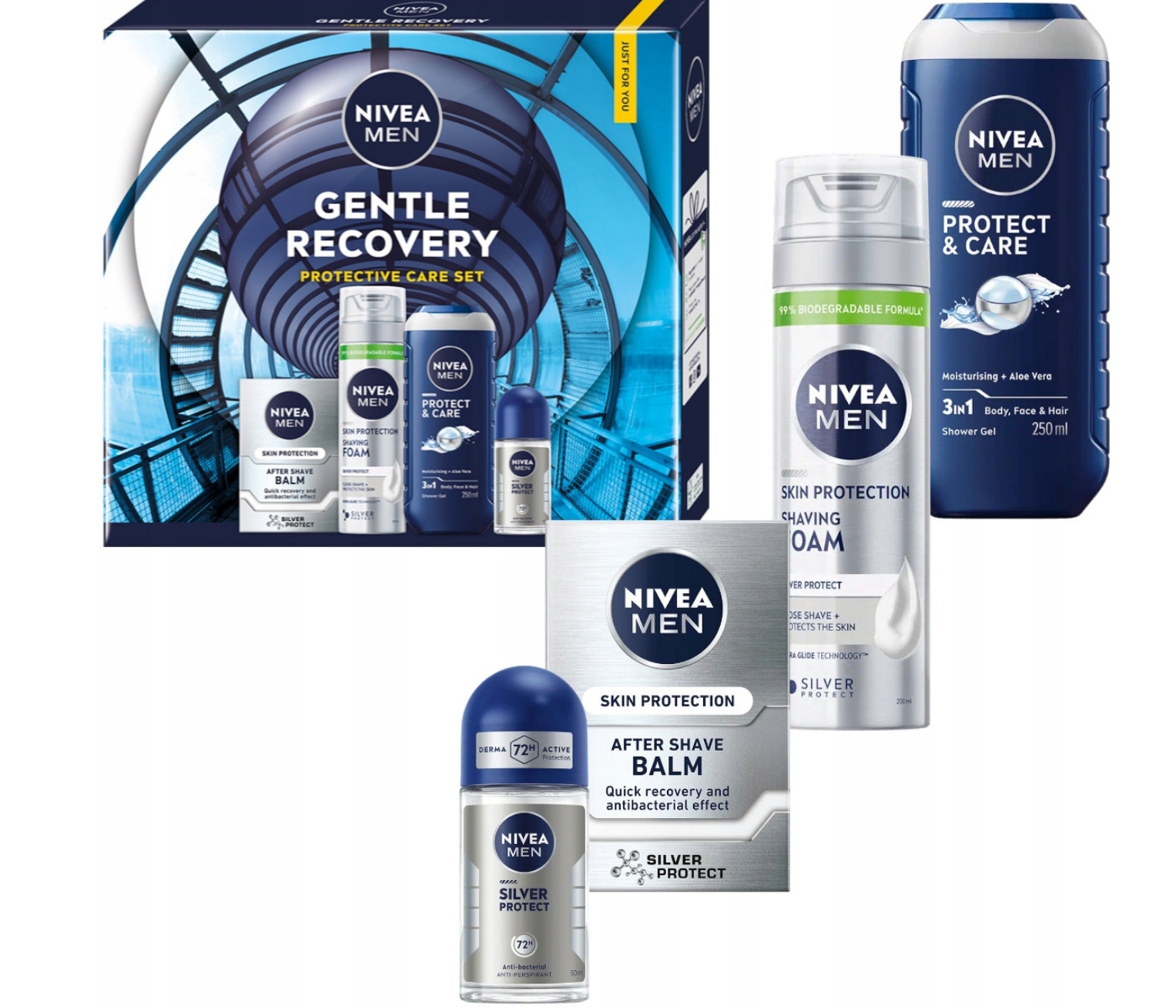 NIVEA MEN SENSITIVE RECOVERY – серія косметики з унікальною формулою, збагаченою іонами срібла, ромашкою та провітаміном B5, які не тільки ефективно освіжає шкіру після гоління, а також живить її та підтримує регенерацію шкіри, подразненої голінням. Володіє антибактеріальними властивостями: спеціальна формула з іонами срібла, як науково доведено, зупиняє ріст бактерій і, таким чином, дозволяє довше залишатися свіжими.