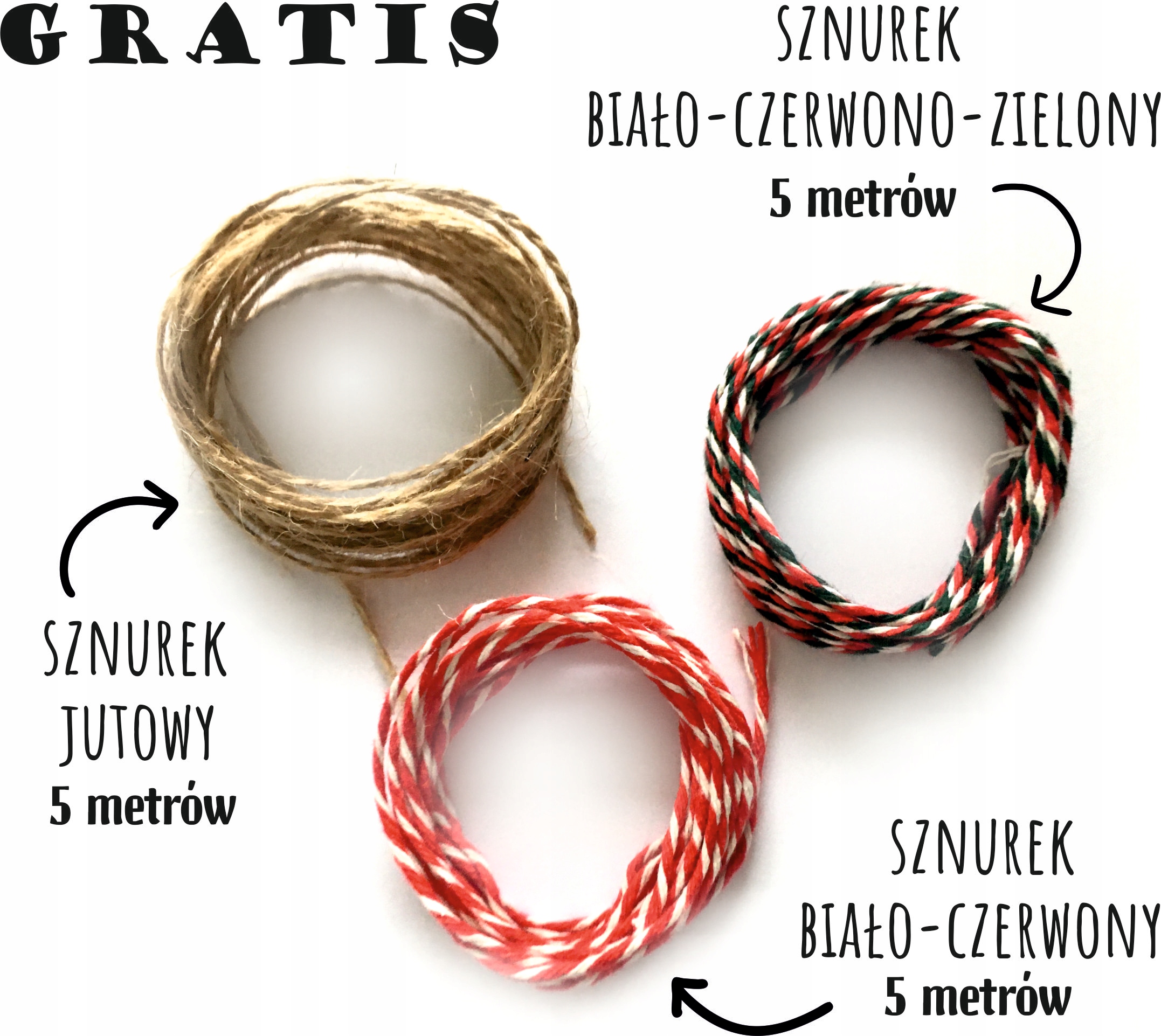 3 рулони Різдвяні нитки по 5 метрів кожна -білі та червоні товщиною приблизно 2 мм, біло-червоно-зелені товщиною приблизно 2 мм та джутові товщиною приблизно 2 мм
