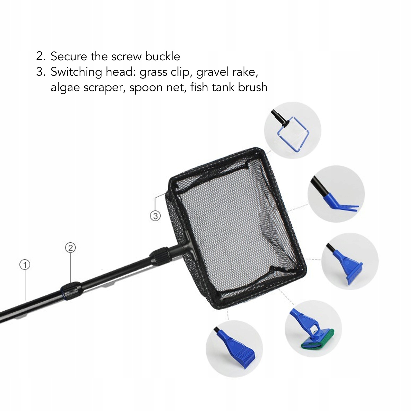 1. ЕКОНОМІЯ ЗУСИЛЬ ТА ЕФЕКТИВНІСТЬ: набір інструментів для чищення 5-в-1 допоможе вам підтримувати акваріум у чистоті й порядку, не намочуючи рук. Полегшує прибирання. 5 насадок легко замінити та встановити. Легка заміна 5 насадок для різних головок.