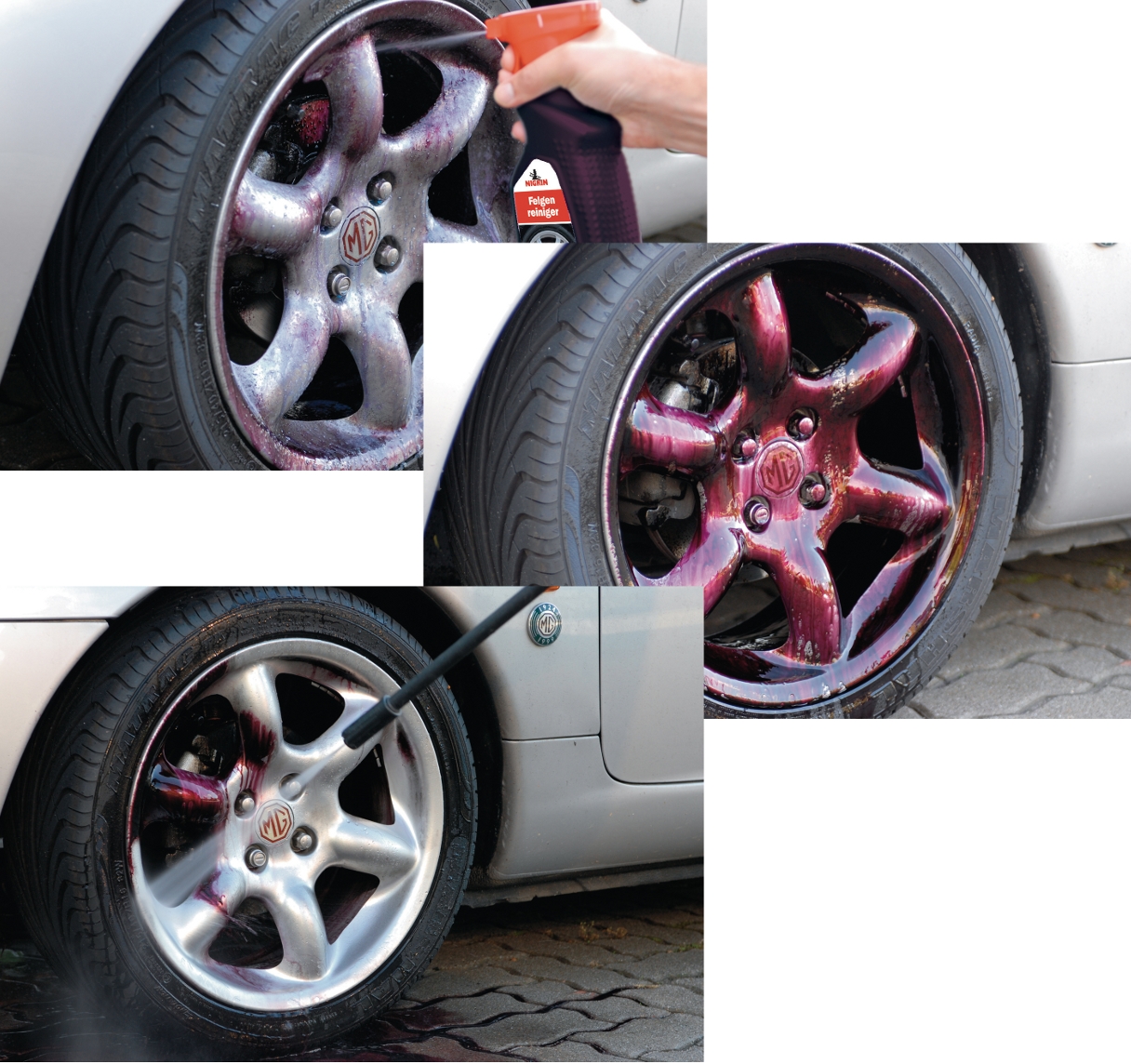Розпиліть засіб на холодні та сухі обідки. Кольоровий індикатор вказує на процес дії засобу: він змінює колір із синього на фіолетовий при розчиненні запеченого гальмівного пилу. Після зміни кольору на темно-фіолетовий можна бути впевненим, що обід очищений. Промийте обід за допомогою мийки високого тиску та висушіть.