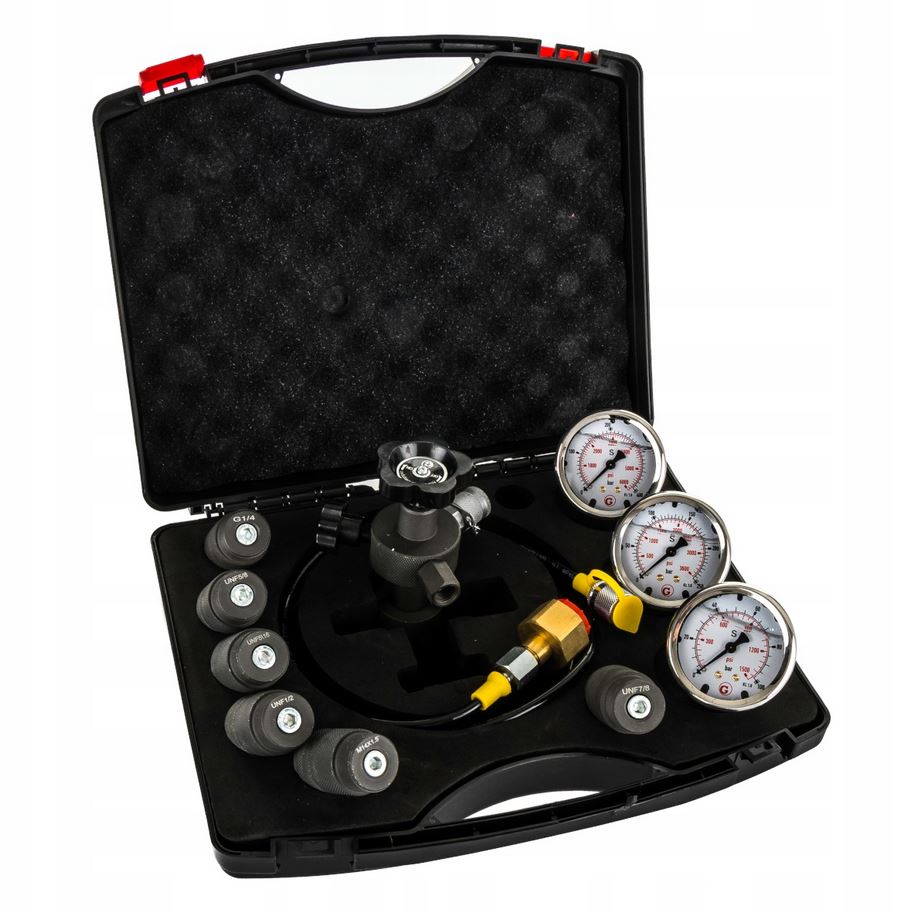 Набір для перевірки і заправки гідроакумуляторів, 3 манометра + 6 адаптерів