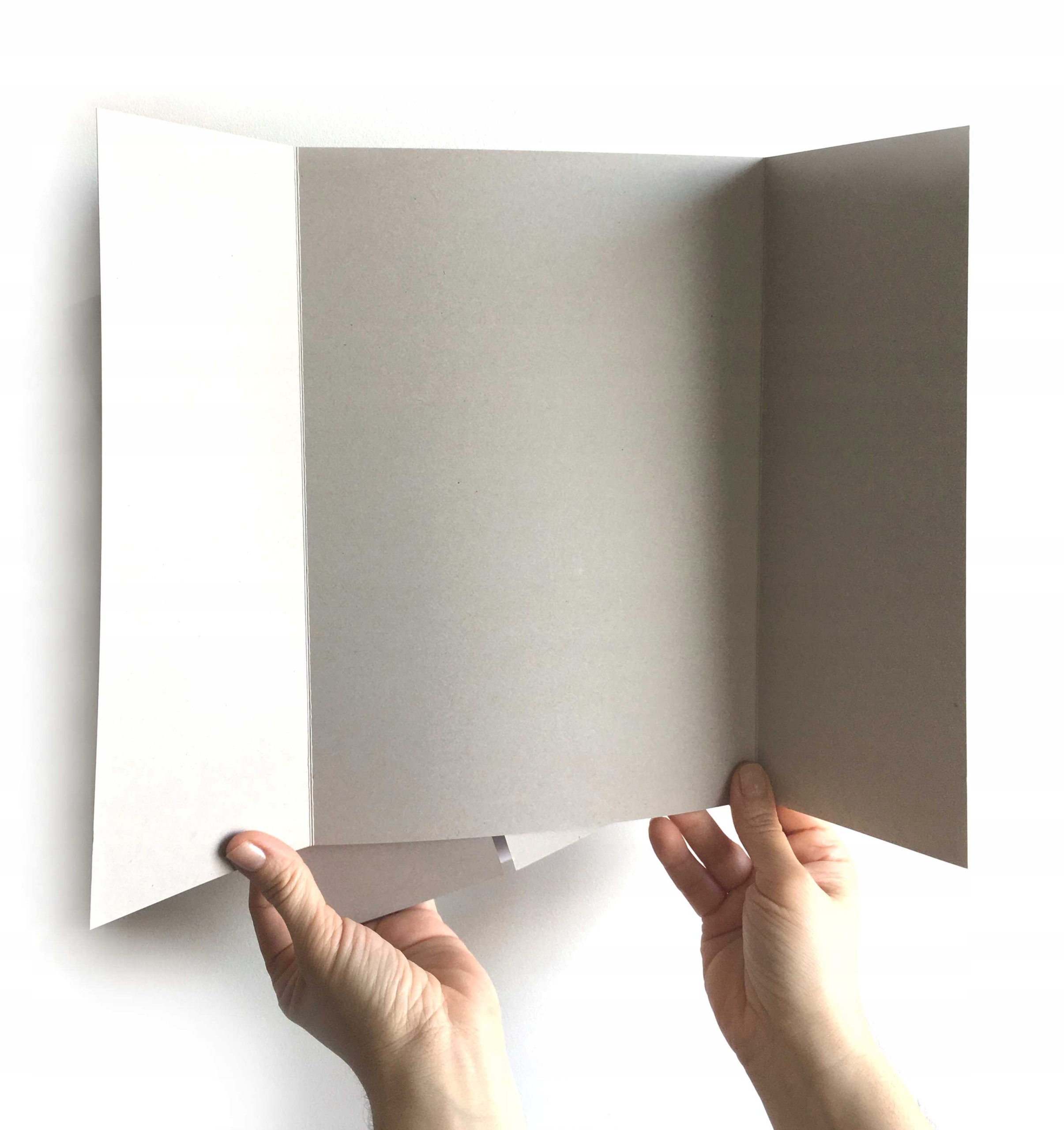 - 2 штуки складена папка до формату А4 (розмір після складання приблизно 21x29,7 см) з сірого та білого паперу (білий з одного боку, сірий з іншого) вага прибл. 250 г - одна папка сіра і біла