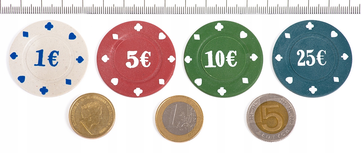 - 100 професійних жетонів (загалом 1025 євро!) стійких до стирання у 25 кольорах синього (25€), зелений (10€),червоний (5€) і білий (1€),
