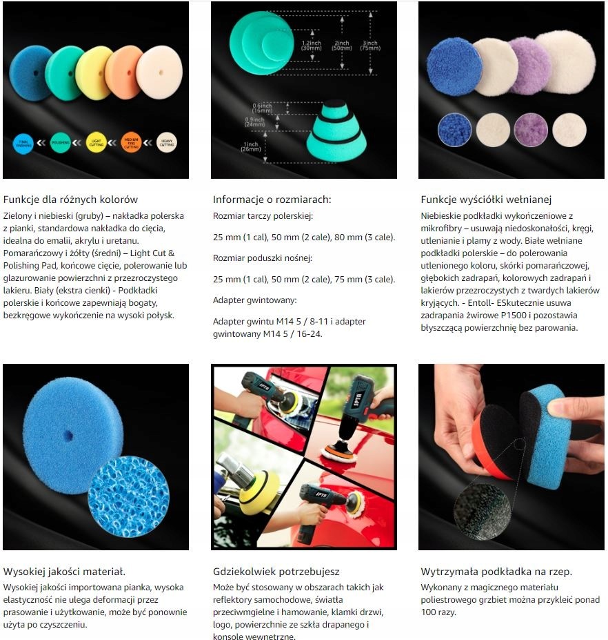 - ▲ Особливості: високоякісна вовняна подушечка, полірувальна губка, гнучка, придатна для прання та багаторазового використання. Губки різних кольорів мають різну м'якість, відповідають всім вимогам, підходять для полірування грубих і невеликих ділянок. Завдяки самоклеючій тильній стороні подушечки можна змінити за лічені секунди.