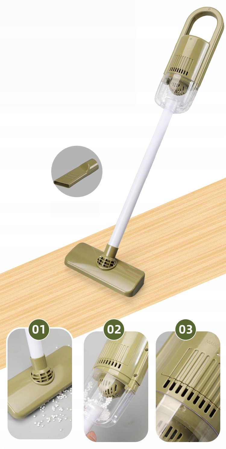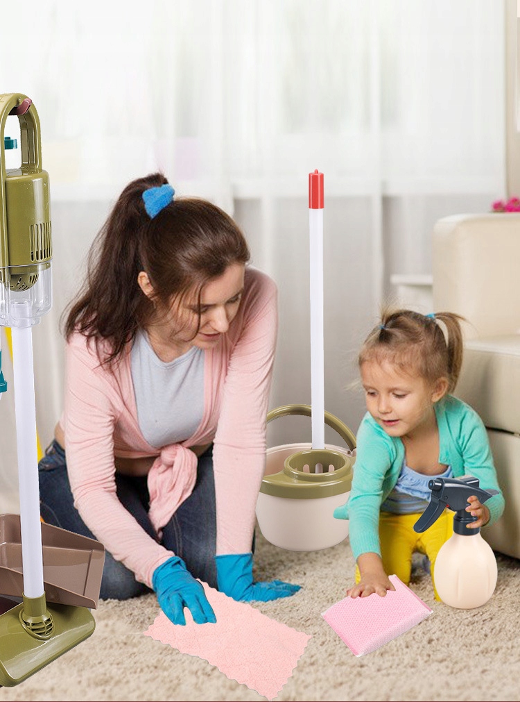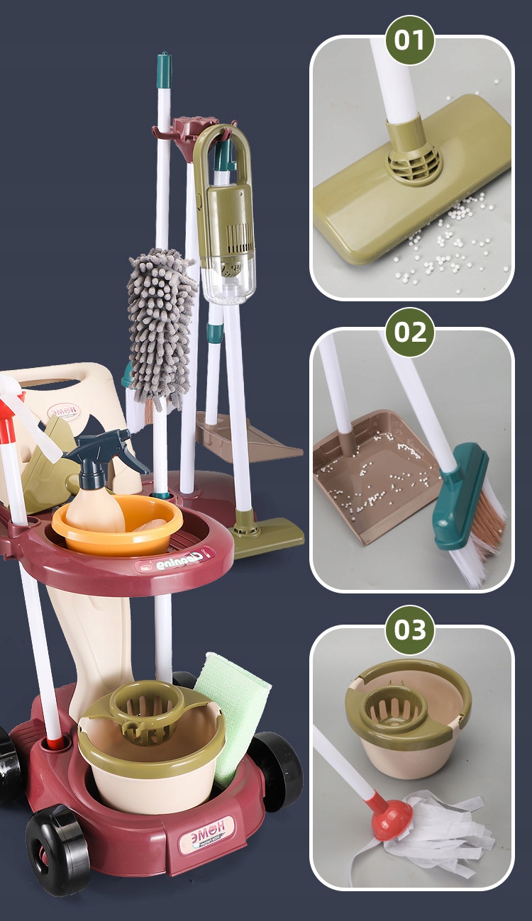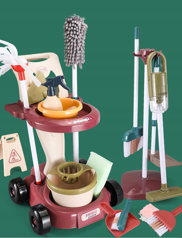 Набір оснащено візком для прибирання, на якому можна розмістити різні аксесуари, наприклад губки або ганчірки. Для миття підлоги можна використовувати відро зі шваброю, а для прибирання пилу — віник із совком. Щітки та ганчірки зроблять наші меблі сяючими! Завдяки підставці всі пензлі будуть в одному місці.