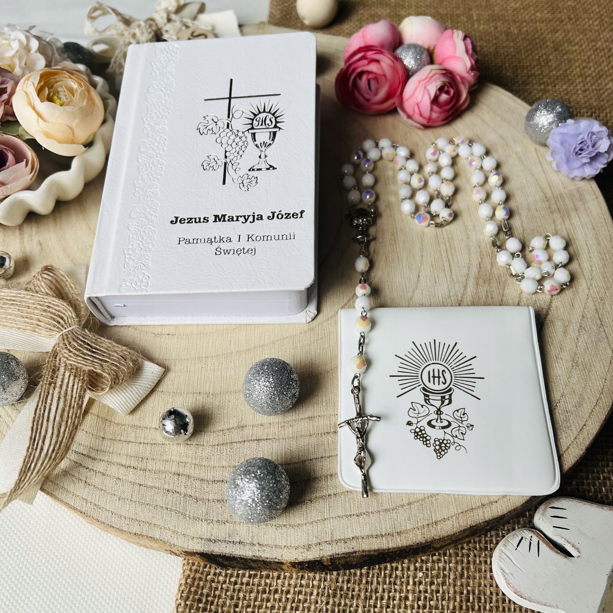 Набір для причастя - вервиця у футлярі та молитовник JMJ