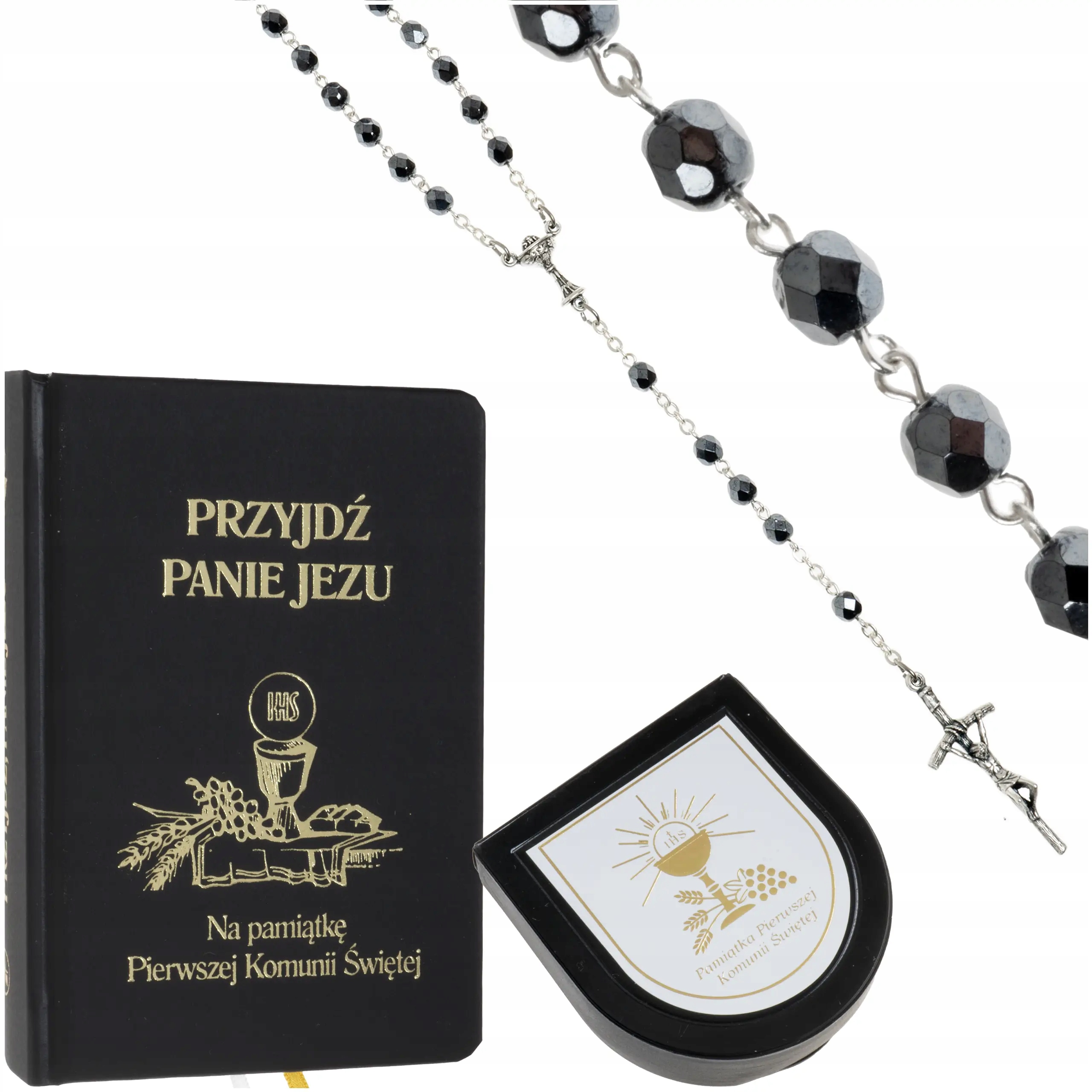 Книга для причастя Прийди, Господи Ісусе, чорна + Розарій для причастя з графітовими кристалами + Елегантна чорна коробка для розарію «Підкова»