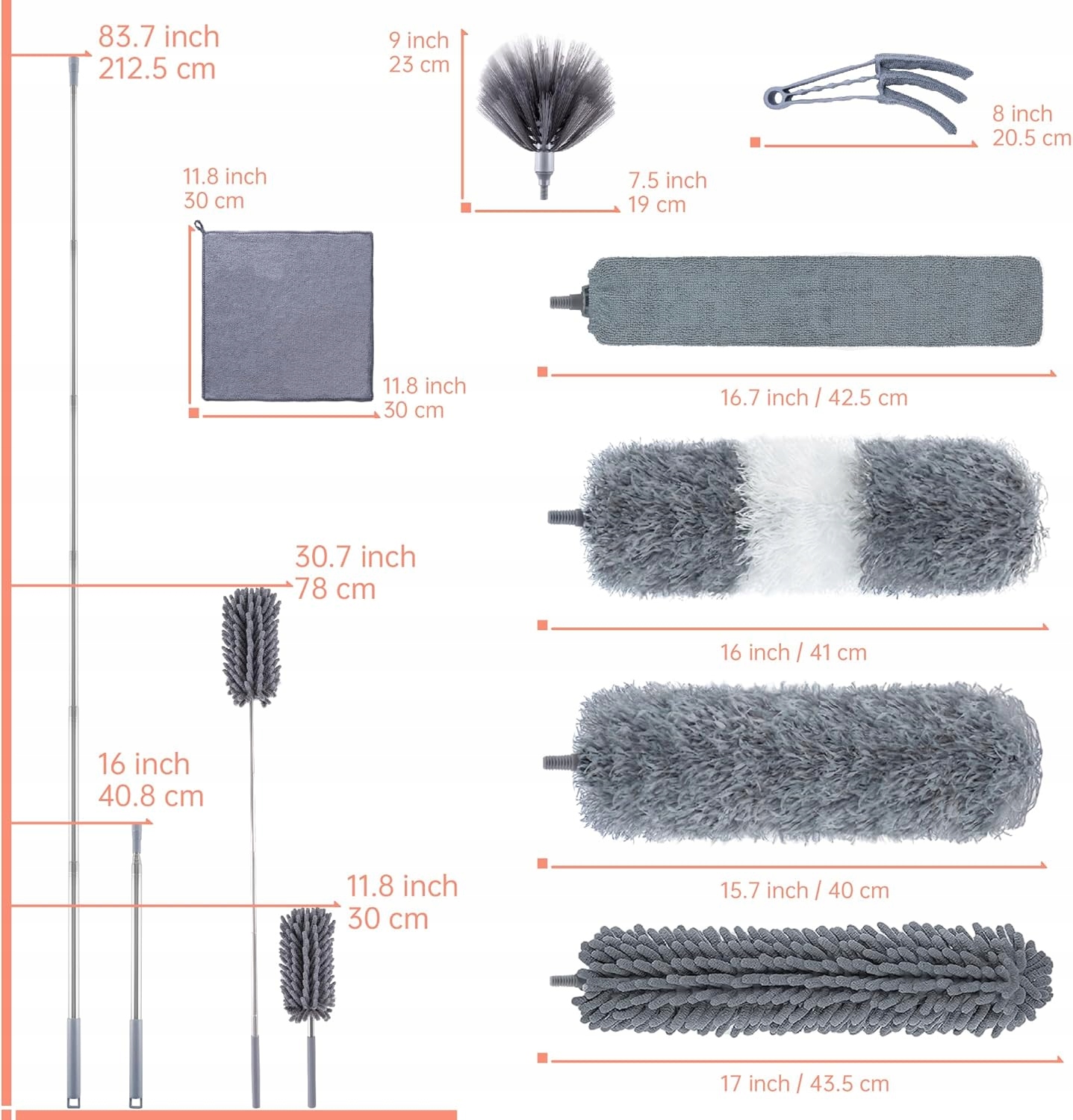 - За допомогою регульованої телескопічної щітки для пилу ви можете легко очистити стелю, меблі, автомобілі, днища диванів, штори, полиці та павутину в кожному кутку. Просто замініть відповідну головку, щоб легко дістатися до важкодоступних місць.