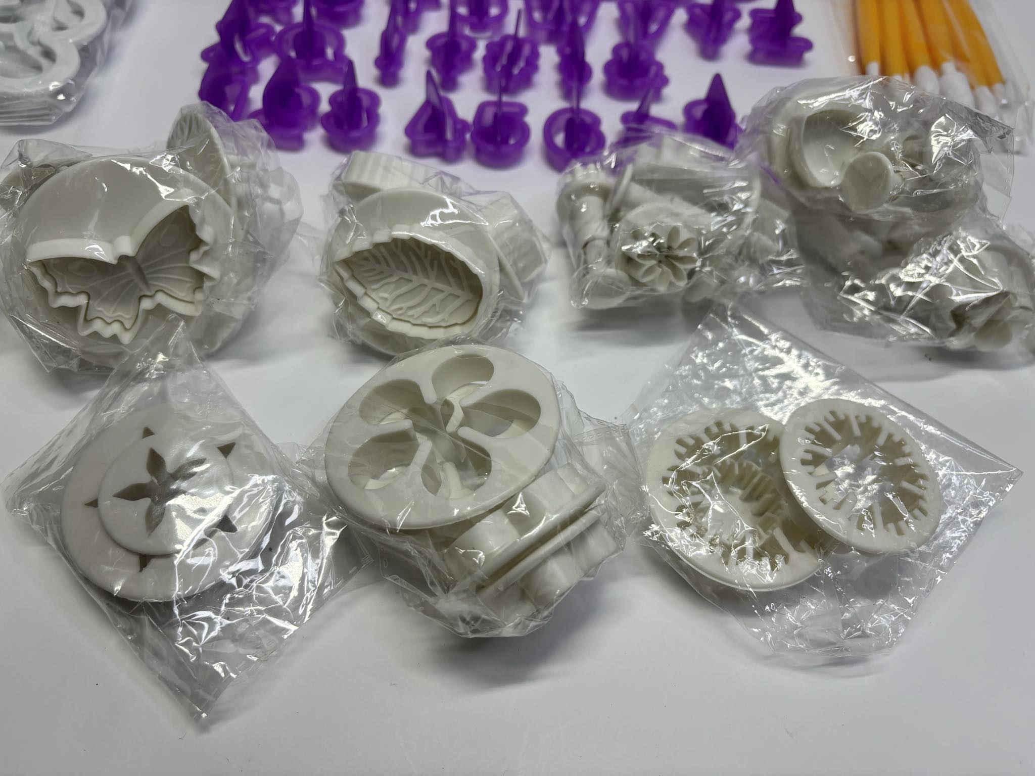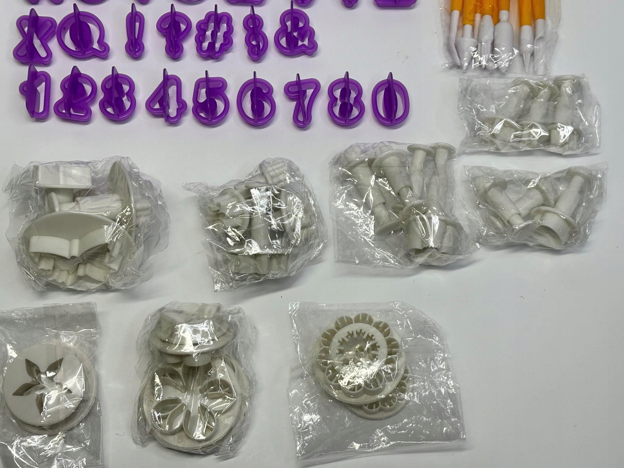 - Форми з кнопкою для видавлювання прикрас і печива: 3x квітка, 3x метелик, 4x маленька квітка, 4x маленька квітка, 3 міні-зірочки, 3 міні-сердечка, 3 маленькі листочки