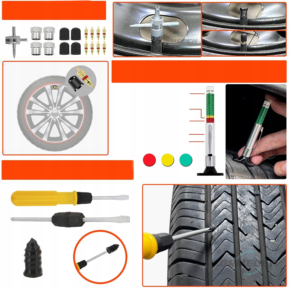 【Додаткові інструменти для клапанів】Набір для ремонту шин включає напилок з Т-подібною ручкою, інструмент для вставки Т-подібної ручки, 20 самовулканізуючих заглушок для шин і різак. Також містить набір інструментів для клапанів: інструменти для 4-ходових парових клапанів, 8 стандартних сердечників клапанів, 4 стандартних кришки клапанів і 4 хромовані кришки клапанів.