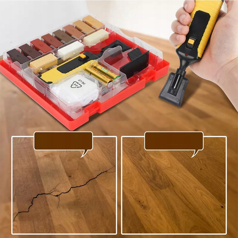 ремонт набору для деревини та паркетів, для легких та глибших подряпин, тріщин, отворів та точок тиску, дорогий ремонт вже в минулому. Купуйте цей комплект для ремонту для ламінату у восковому блоці, ви можете відремонтувати всі дерев’яні ламіновані підлоги, паркет, пробкові та дерев’яні меблі, такі як стільці, столи, шафи, робочі місця, двері, полиці та шафи
