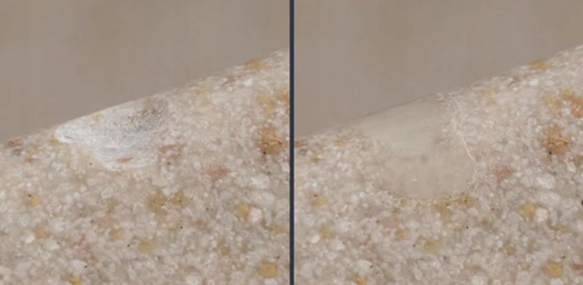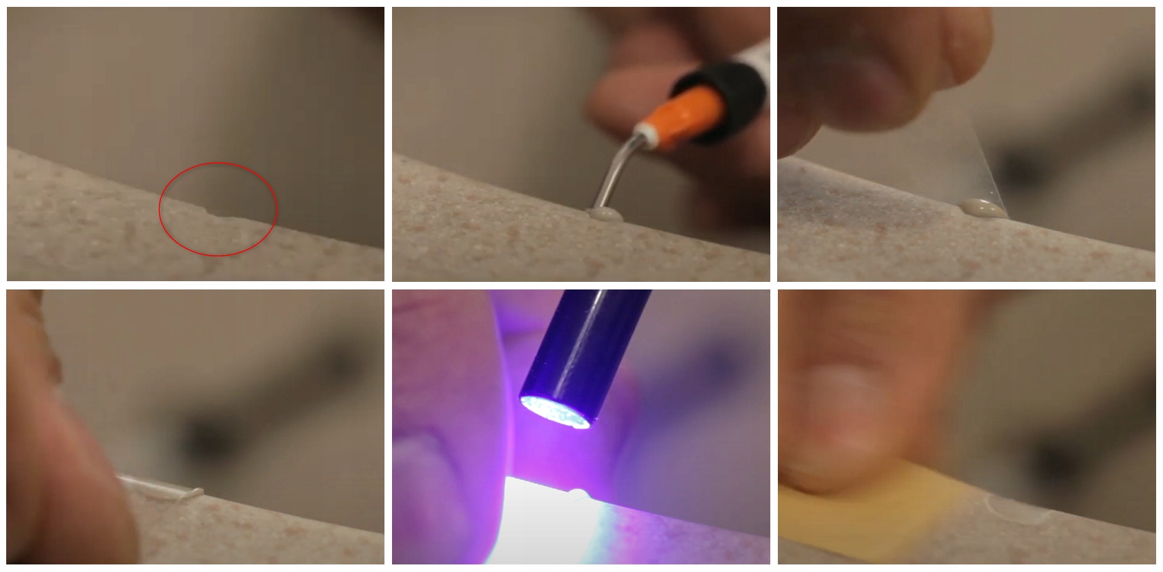 Набір, що містить препарат світлової полімеризації для ремонту дефектів, сколів і зазубрин на поверхнях з природного каменю (граніт, мармур, вапняк, піщаник), а також на композитах і конгломератах. Його можна використовувати для ремонту кухонних стільниць, підвіконь, сходів, умивальників, душових піддонів, надгробків та інших виробів з каменю. Наповнювач твердіє протягом декількох хвилин і після затвердіння набуває термостійкості в діапазоні від -40°C до +150°C. Відремонтовану шпаклівкою ділянку можна шліфувати, фарбувати або обробити механічним способом (свердлінням отворів). Не використовуйте для заповнення тріщин.