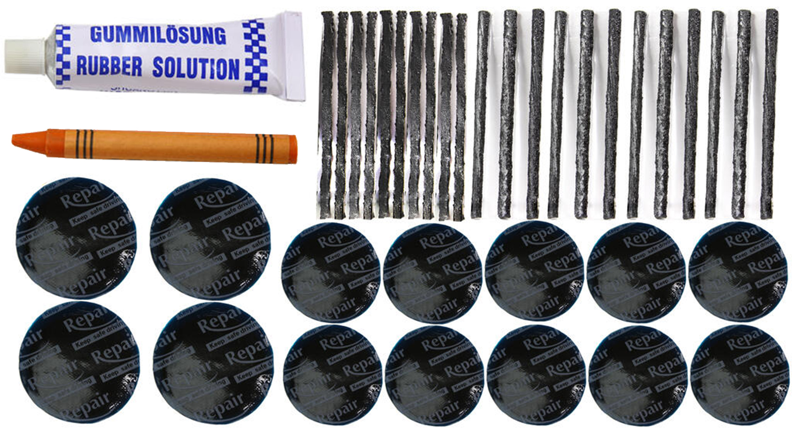 Набір включає, серед іншого, самовулканізуючі шнури, ремонтні латки, вулканізуючий клей, шила і навіть плоскогубці та крейду.