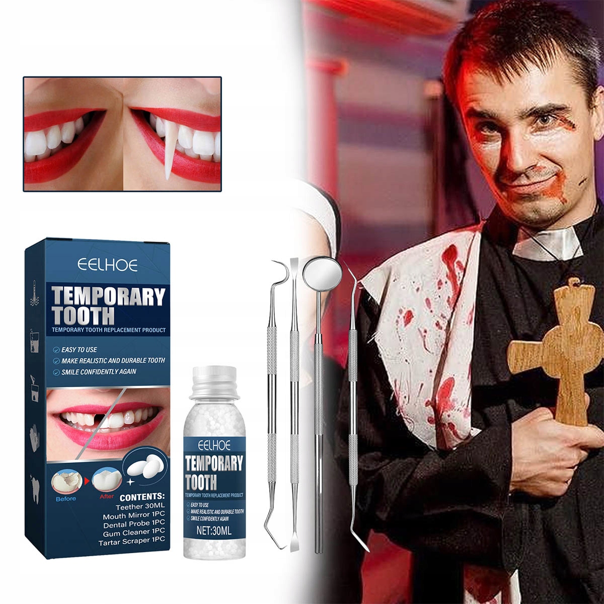 ✔️ Тимчасовий ремонт:Цей тимчасовий набір для ремонту зубів можна використовувати для тимчасового ремонту відсутніх або зламаних зубів, допомагаючи людям, які втратили зуби, швидко повернути гарну посмішку.