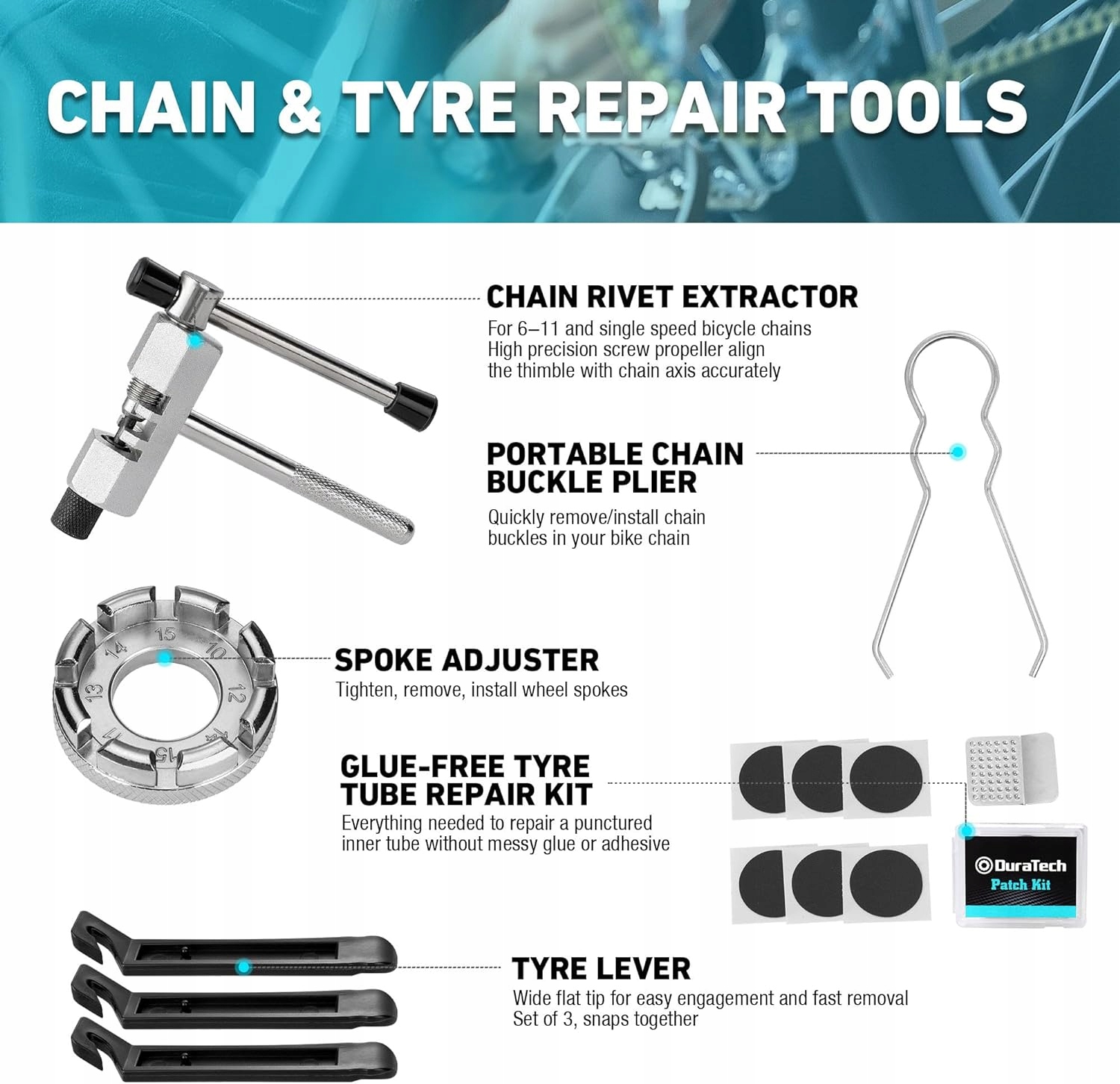 ✅ Наш набір для ремонту велосипеда містить усе необхідне для підтримки ваших велосипедів у ідеальному стані. Незалежно від того, чи це ремонт шин, заміна ланцюга чи інші сервісні роботи, цей набір інструментів дозволить вам легко виконати ремонт і заощадити додаткові гроші.