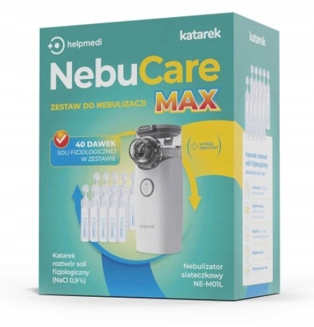 У набір NebuCare MAX також входить фізіологічний розчин Katarek - ізотонічний розчин 0,9% NaCl, який можна використовувати з профілактичною метою для зволоження дихальних шляхів. Також нею можна розводити ліки для інгаляцій. Фізіологічний розчин Катарек також підходить для різних процедур по догляду, зокрема: для промивання ран, гігієни очей, носа. Фізрозчин зазвичай використовується для розведення ліків, що вводяться в небулайзері. У набір входить збільшений запас солі - цілих 40 ампул!