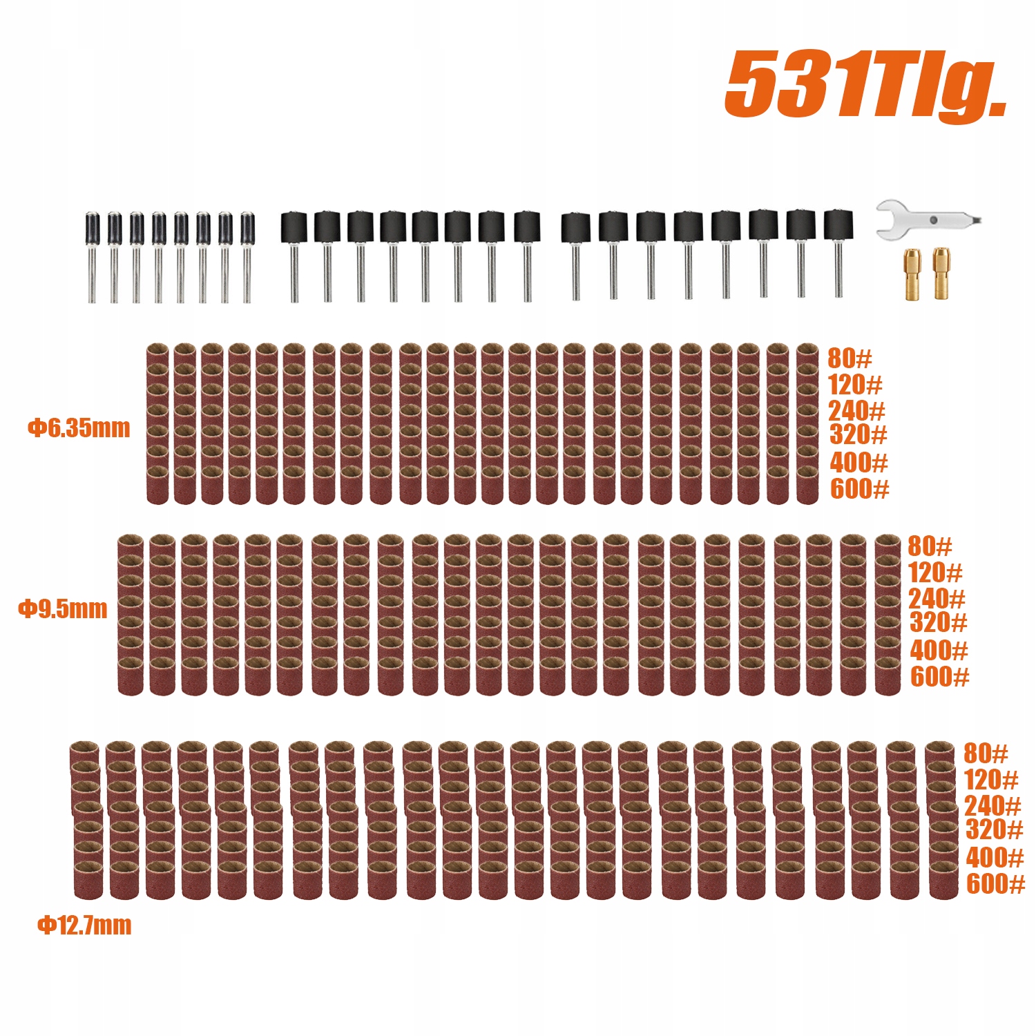 Шліфувальні стрічки: шліфувальні стрічки на 531 штуку містять 6 зернистостей (зернистість 80, зернистість 120, зернистість 240, зернистість 320, зернистість 400, 600) 3 діаметрів.