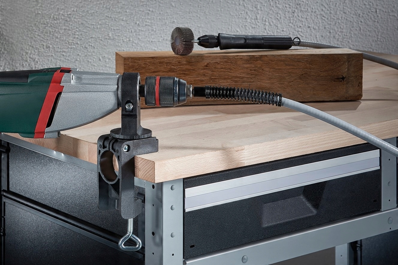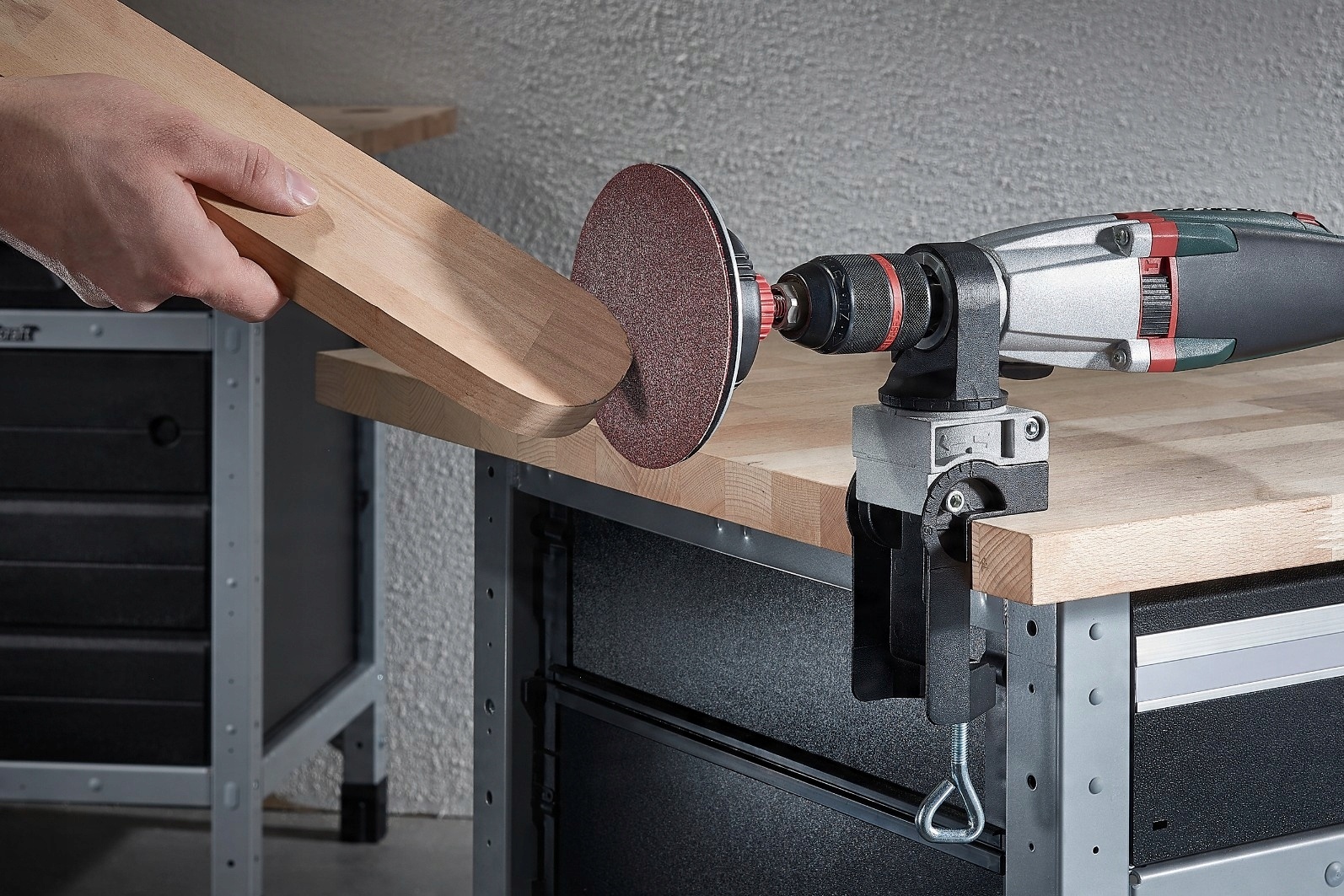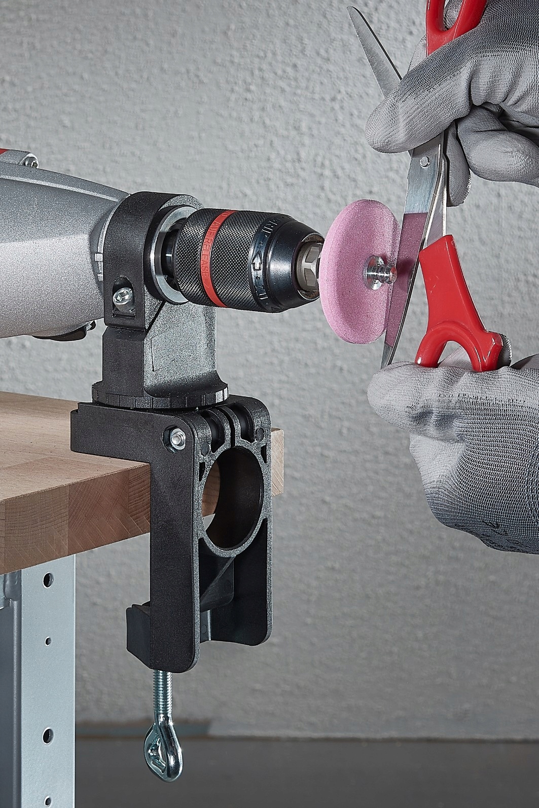 Універсальний настільний тримач для дрилів і шліфувальний дискfixoflex дозволяють перетворити дриль на стаціонарну болгарку і обробляти предмети в так само, як і з дисковою шліфувальною машиною.