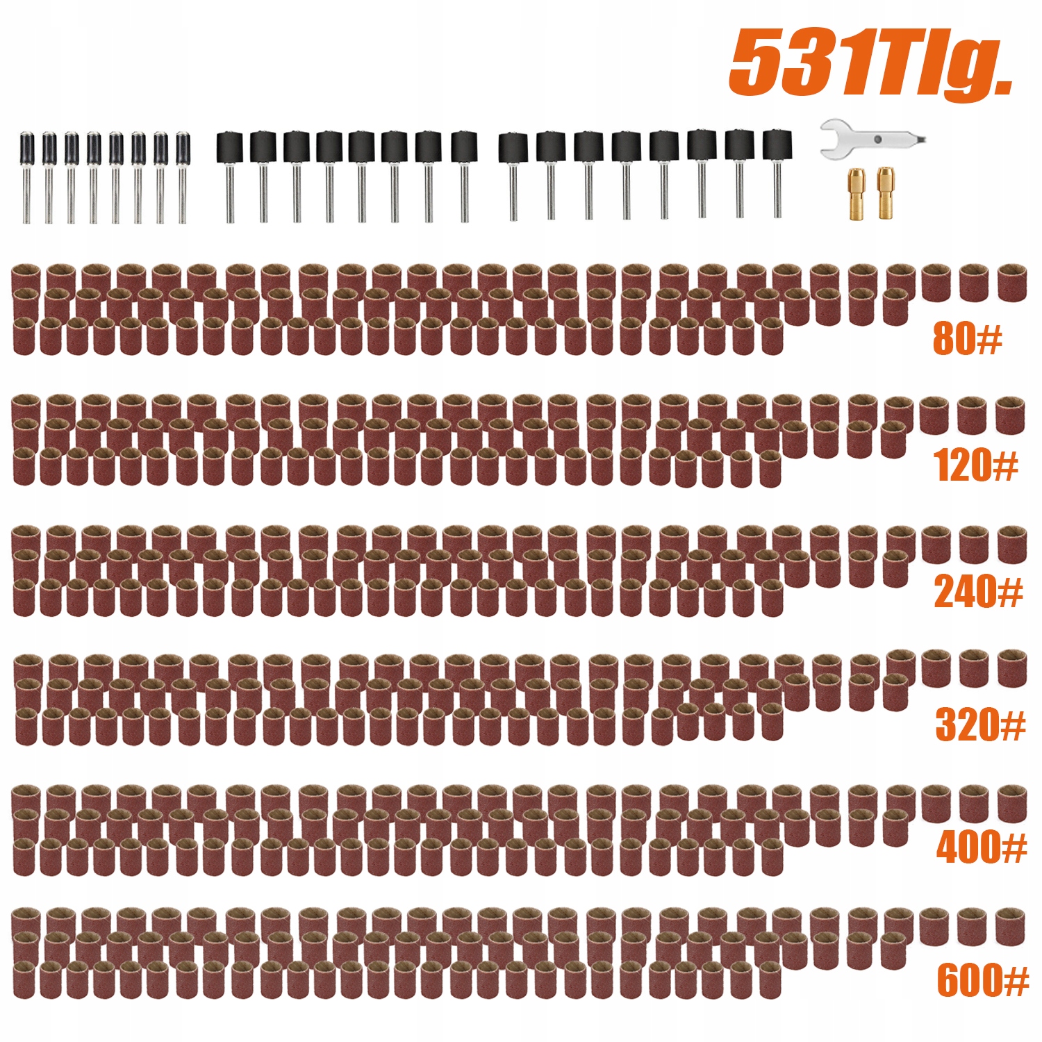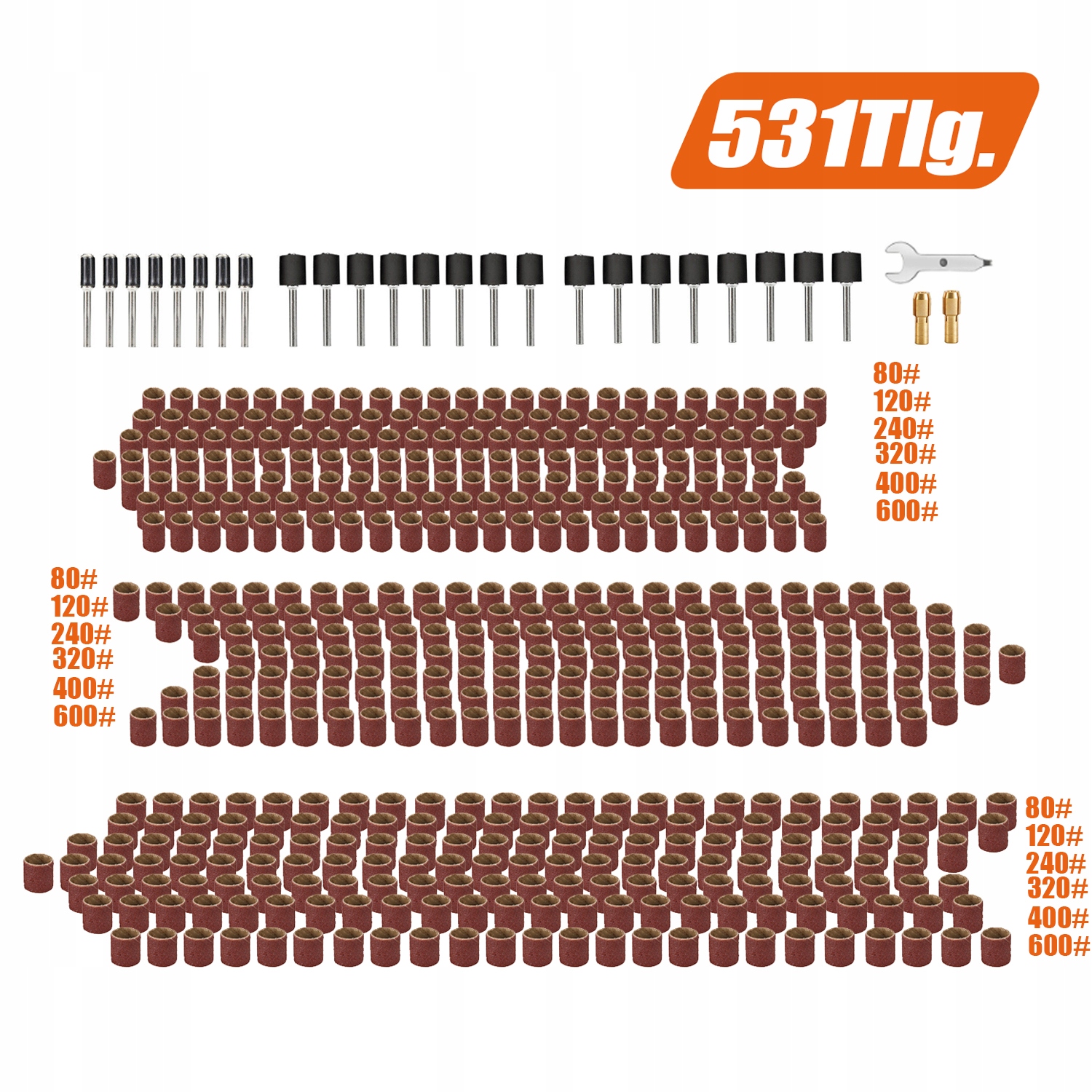 Шліфувальні стрічки: шліфувальні стрічки на 531 штуку містять 6 зернистостей (80 зернистість, 120 зернистість, 240 зернистість, 320 зернистість, 400 зернистість, 600 зернистість) у 3 діаметрах.